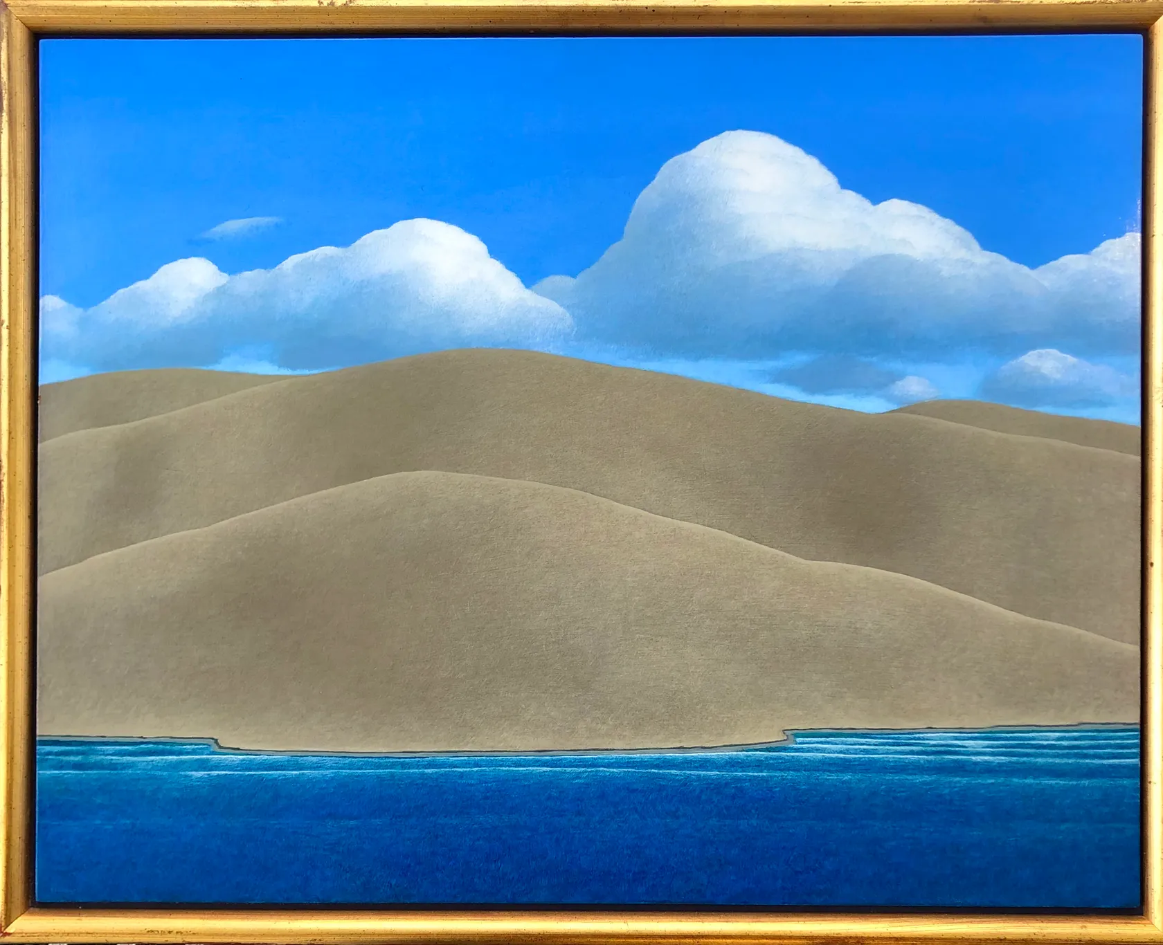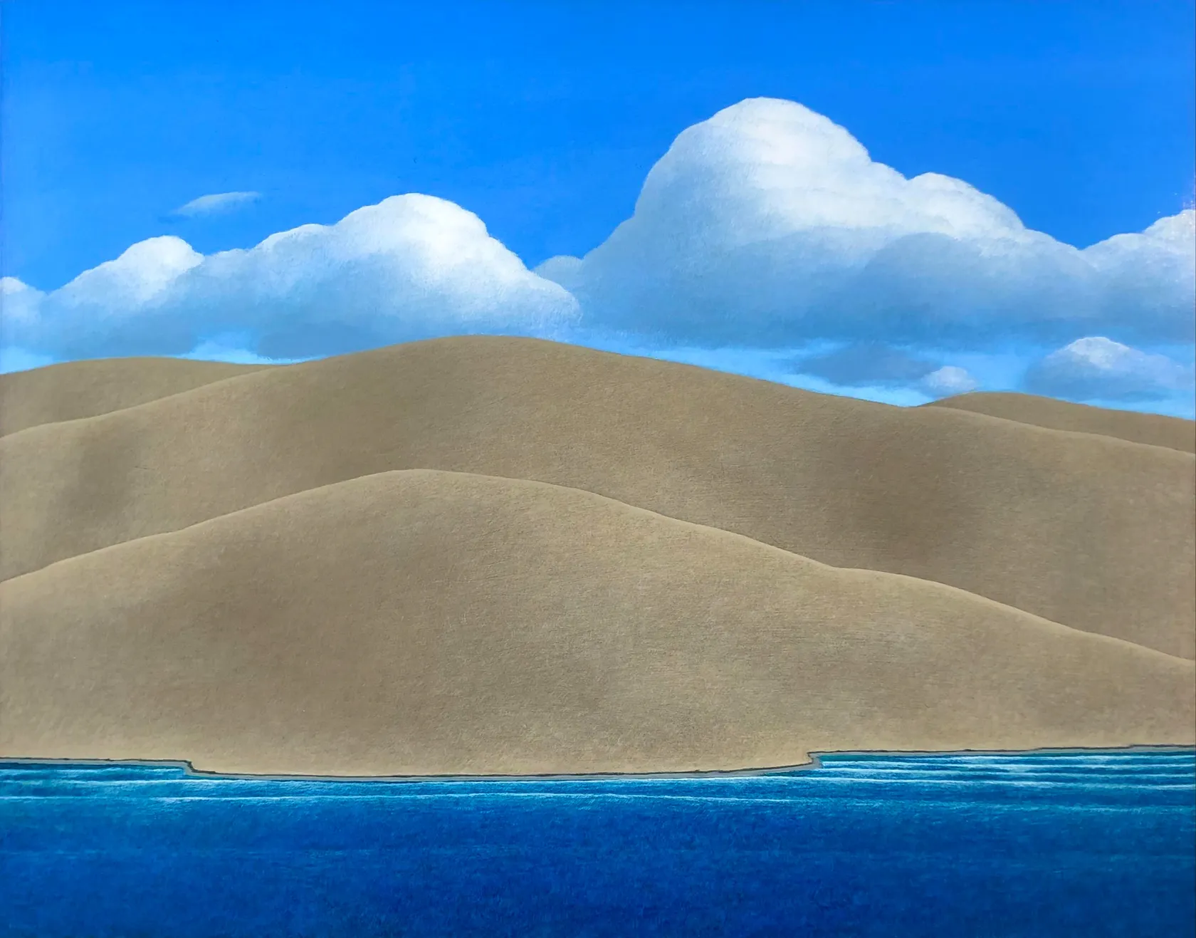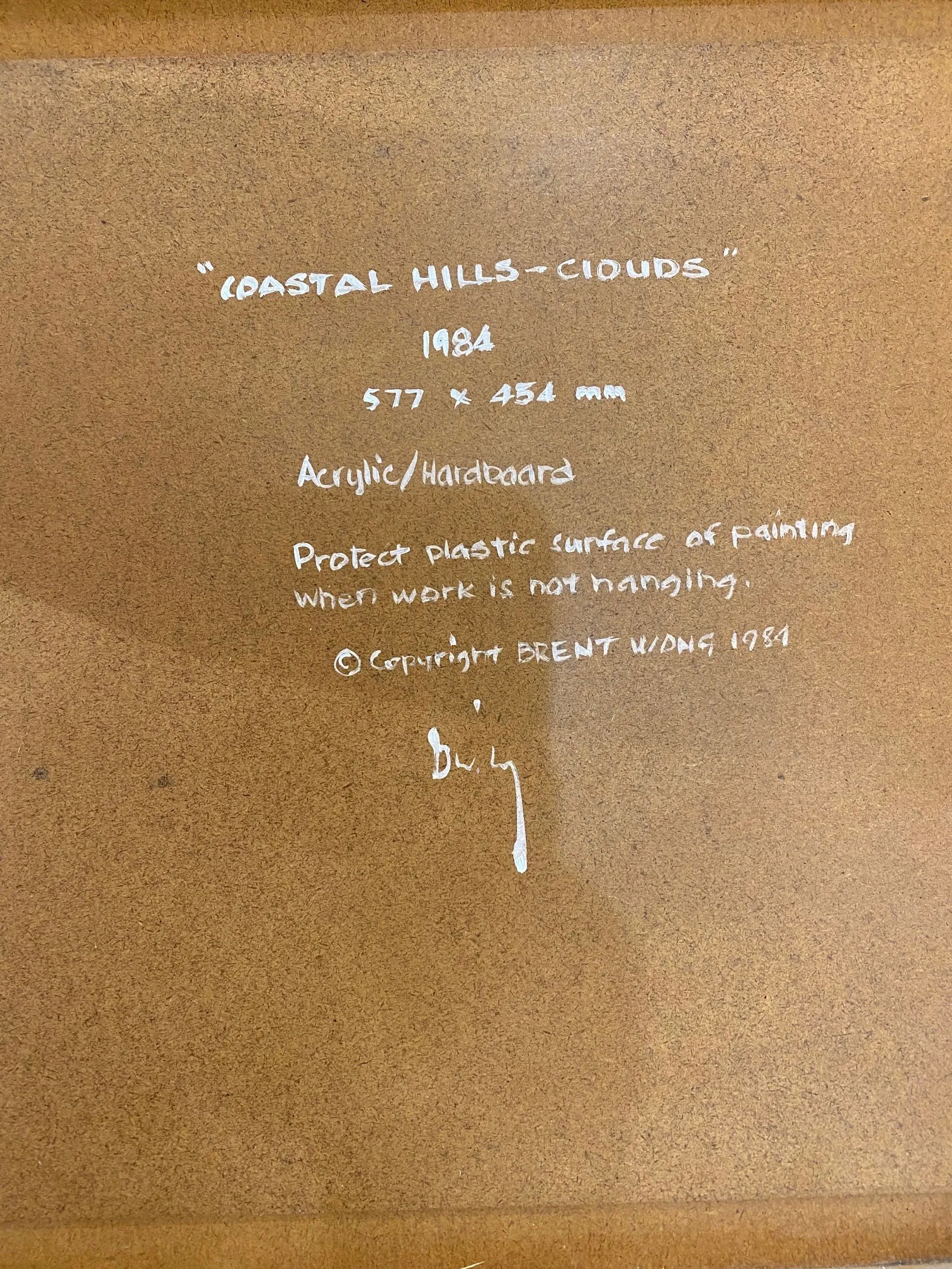 Land and seascapes played a large part in the early work of Otaki-born painter Brent Wong. Growing up in a flat over his uncle’s shop in Vivian Street Wellington, he briefly studied design at Wellington Polytechnic, but was mostly self-taught as a painter. He became fascinated with architecture and mathematical perspective. As his realist style developed, surrealist elements appeared like architectural flying saucers in the sky, making his work unique and highly sought after for public and private collections. The Dowse Gallery in Lower Hutt mounted a survey exhibition of his work in 1978 which ended its tour of the country at the National Art Gallery in Wellington. By the early 1980s, clouds had begun to play a prominent part in his compositions. In this work, cumulus masses roll in over ochre hills in a generic coastal scene. It is a raw and uninhabited geography, perhaps the Kapiti Coast in late summer where the hills roll down to the sea or a particularly parched part of the East Cape. The sense of geological newness, and the effects of intensive pastoral farming which have denuded the land of its vegetation are instantly recognisable to any New Zealander. LINDA TYLER