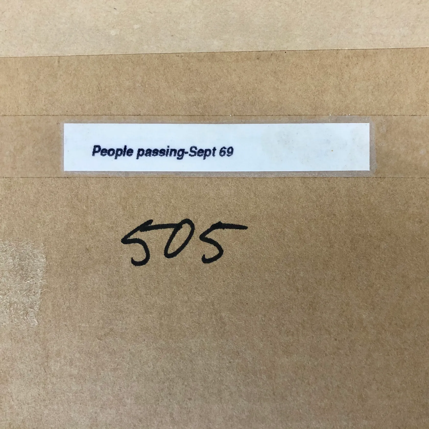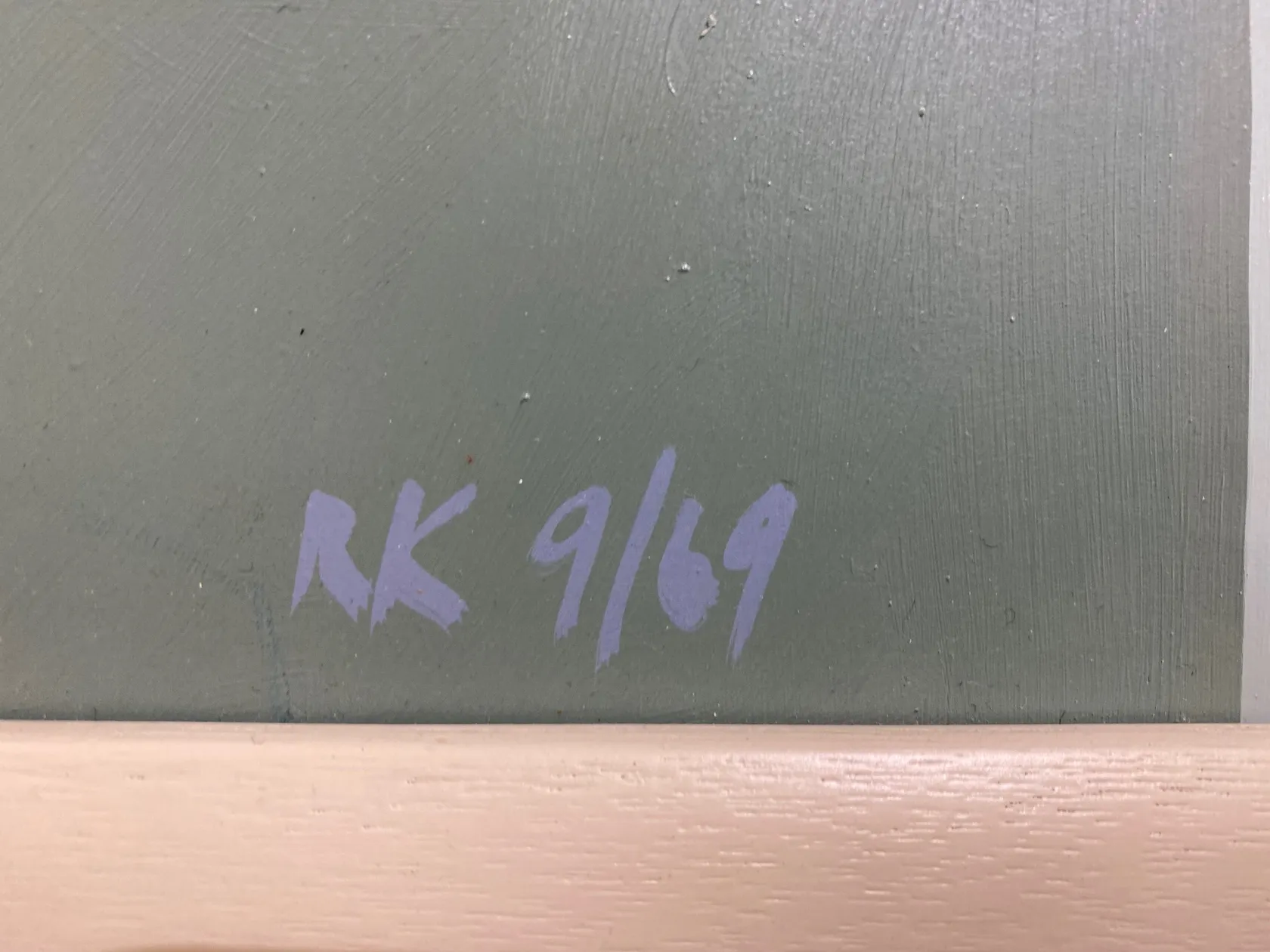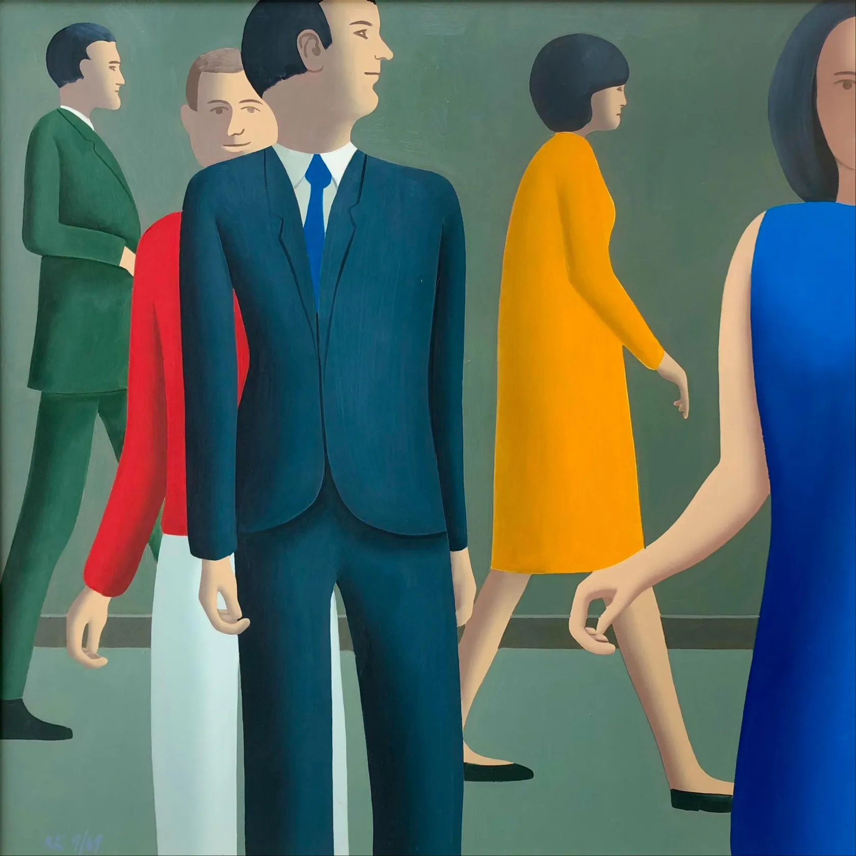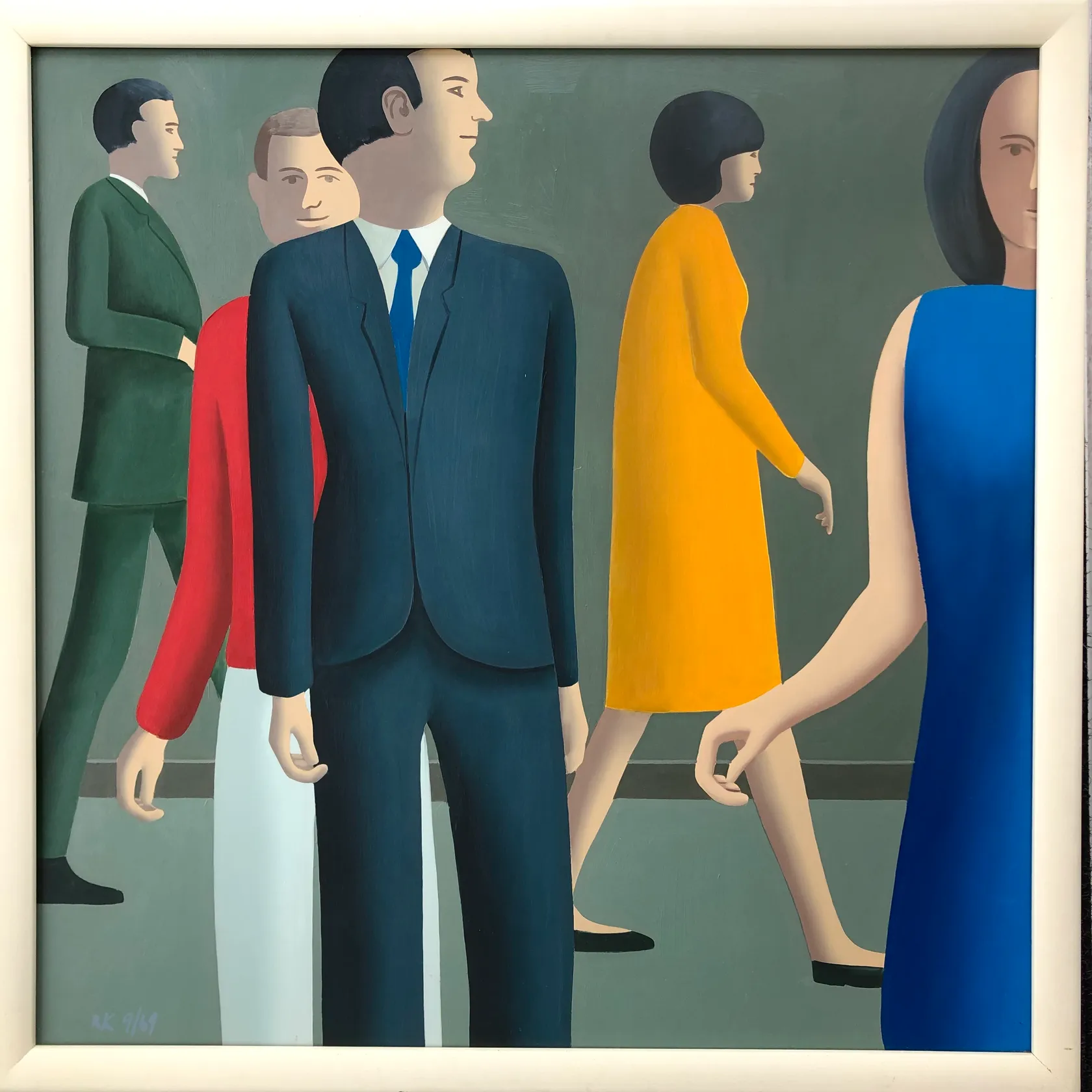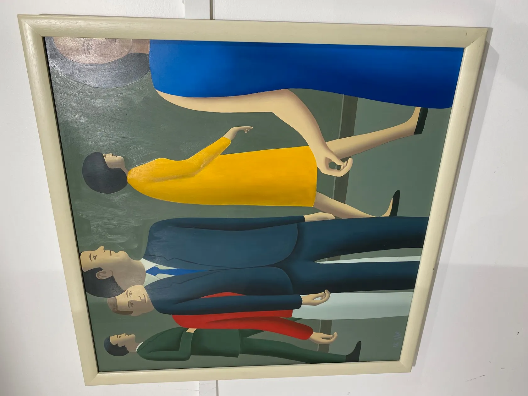 Richard Killeen has been an exhibiting artist since 1967, with dealers in Sydney and New York. Locally he is represented by Ivan Anthony and Peter McLeavey galleries who have placed his works in major corporate and private collections as well as in the collection of each of the major metropolitan public art galleries. There are twenty works in the Museum of New Zealand Te Papa Tongarewa and Killeen’s Post-Modern cut-out series was the subject of Francis Pound’s 1987 PhD dissertation. Major exhibitions devoted to his practice have toured nationally, a distinction previously reserved for first generation modernists Gordon Walters and Colin McCahon. The son of a signwriter, and with Irish Catholic ancestry, Killeen first came to prominence as a 19-year-old at the Elam School of Fine Arts in 1965 when one of his painting tutors, Colin McCahon, chose him as his assistant on a large commission to paint windows for the Convent Chapel of the Sisters of Our Lady of the Missions in Upland Road, Remuera. The windows are now in the collection of the Auckland Art Gallery. McCahon noticed that Killeen’s compositions seemed assembled from separate parts, like jigsaw puzzle pieces with stylised figures rendered as flattened shapes applied over a neutral background, casting no shadows. Here the simple primary colours of red, blue and yellow brighten the representation of the banality of everyday life as figures cross in two directions on a city street. This painting relates to American Pop Art, but also responds to local traditions of Realism which had been dominated by landscape. Neatly attired in suits and shift dresses of a respectable length, Killeen’s figures are city slickers not country hicks; he is characterising New Zealanders as sophisticated and urbane. Using the frame to cut off the figures draws attention to the artificial nature of this realist construction, allowing investigation of figure and field as image and pattern and lending the image a mysterious, symbolic quality. LINDA TYLER