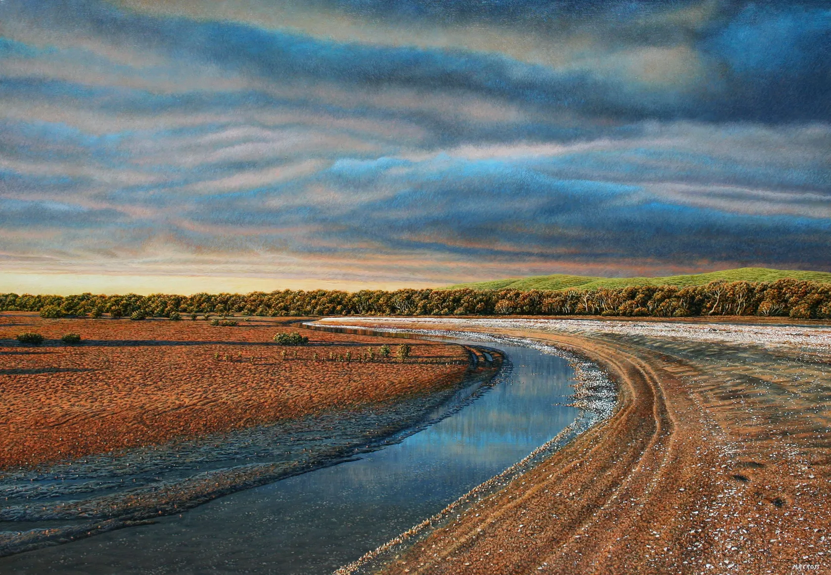 Having been associated with the Okahukura Peninsula on the Kaipara Harbour from infancy, a coastline that has informed my work for many years, this is the last painting I have done of that coastline. Over 50 years or more of freedom camping in various locations around the Tapora Coast, I have walked that whole foreshore assimilating the minutiae of its tidal flats, mangrove forests and estuaries through all manner of tides and weather conditions. This painting is based on a remote location Te Ngaio Point, on the southern side of the peninsula where we would camp in the 80's but is now only accessible by a lengthy trek so hopefully remains as pristine as it always was. Mark Cross