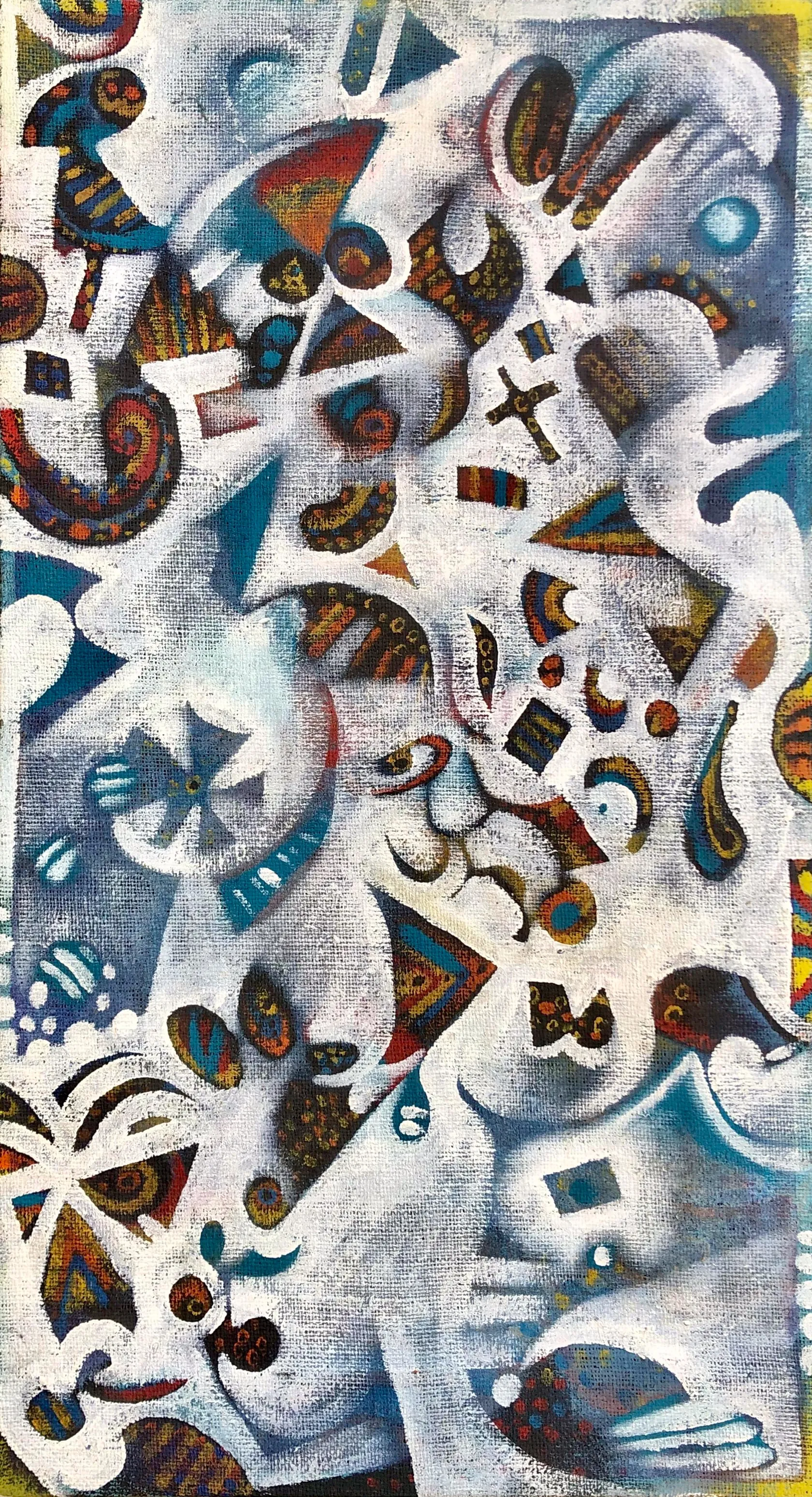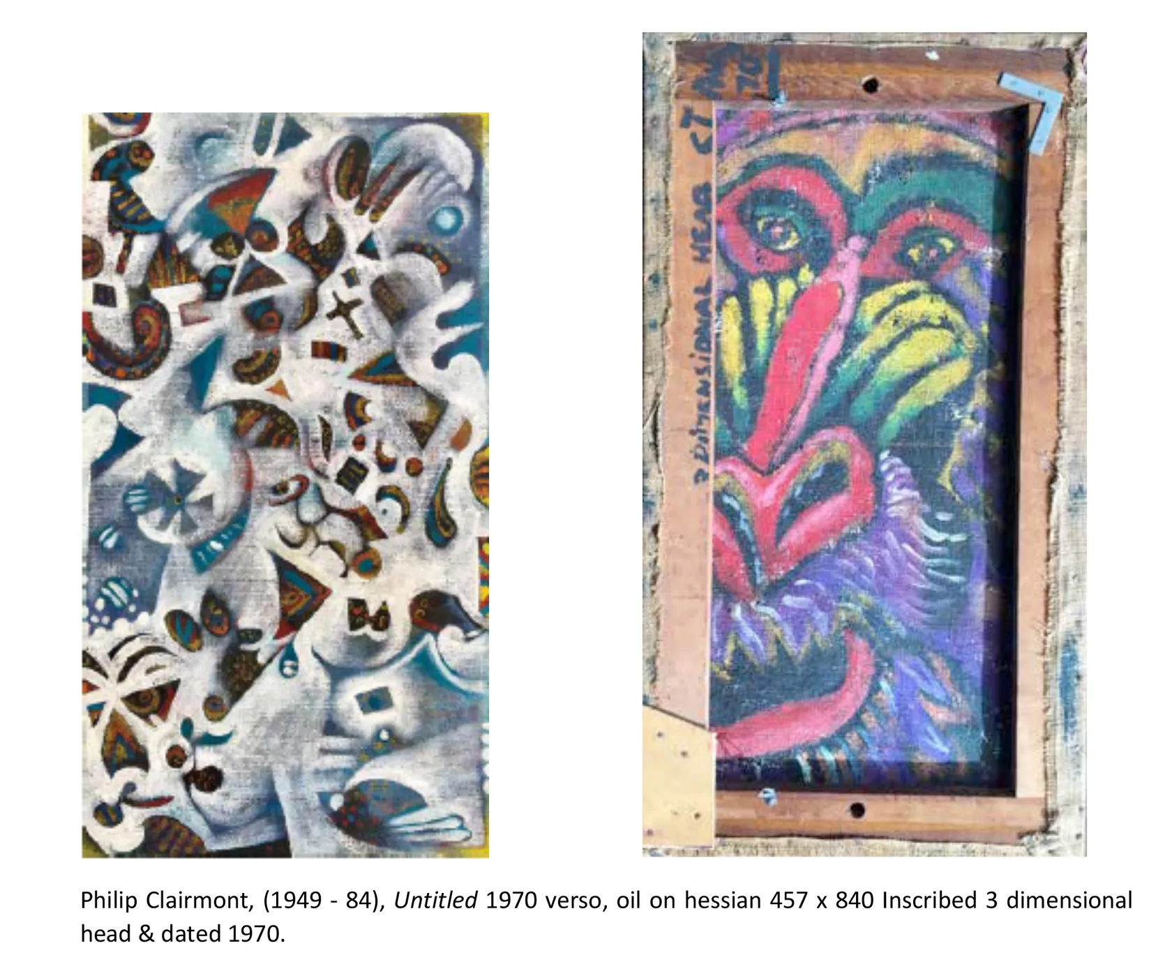 Completed during his Honours year studying painting with Rudi Gopas (1913-1983) in 1970 these two works are rare surviving examples of Philip Clairmont's experimentation with abstraction. He is better known for his representation of recognisable elements in interiors - lightbulbs, couches, staircases, fireplaces - and his self-portraiture, which he described as representations of the inside of his head. Even more unusually, the back of the rectangular work on hessian shows the lurid head of a baboon, a close evolutionary relative of humans, and a creature famously depicted by two of Clairmont's Expressionist art heroes, the English painter Francis Bacon (1909-1992) and the Australian Brett Whiteley (1939-1992). Clairmont was an artist who painted very few animals in his short life. Reflecting on his life for a documentary, he remembered, "I wanted to be a painter or a bullfighter or nothing else." Clairmont did express his admiration for bovines in a painting of a bull, perhaps in a nod to Picasso. But the bravado of this statement about his sense of vocation underscores his remarkable achievement, managing to mount an exhibition of seventy works at Several Arts Gallery in Colombo Street in Christchurch in the late summer of 1970 when he was just 21 years old. LINDA TYLER