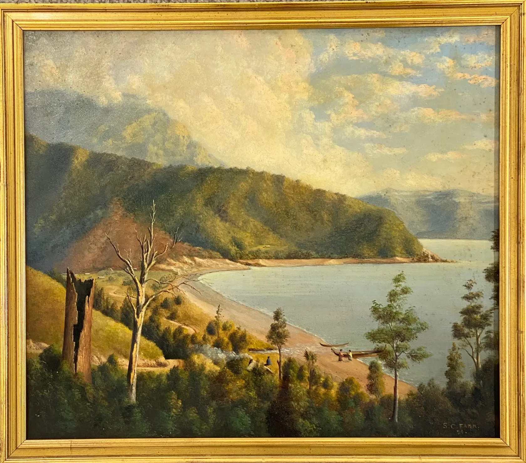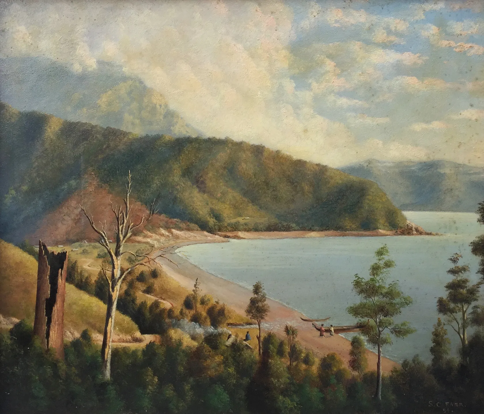 Samuel Coleridge Charles Farr was a topographical artist and Canterbury Province’s first architect. He intended to emigrate from England to Auckland, but shipping problems aboard the Monarch en route to Auckland in 1850 saw him land at Akaroa. He settled in Christchurch and industriously commenced work. Coleridge’s achievements are many, he designing Akaroa’s first church, New Zealand’s first corrugated iron verandahs which provided inexpensive shelter for dwellings and shop fronts, he is also credited with founding Sunday schools throughout Canterbury. Papers Past record his marriage as the first to be celebrated in Canterbury. As a leading member of the Acclimatisation Society, he was responsible for introducing fish to many of Canterbury’s lakes and rivers and was also instrumental in the introduction of the bumblebee to New Zealand. One of his most notable architectural designs was Christchurch’s Cranmer Court, the former Normal School, sadly the building was demolished following damage sustained in the 2011 earthquake. Farr’s paintings rarely appear at auction as most are held by institutional collections.