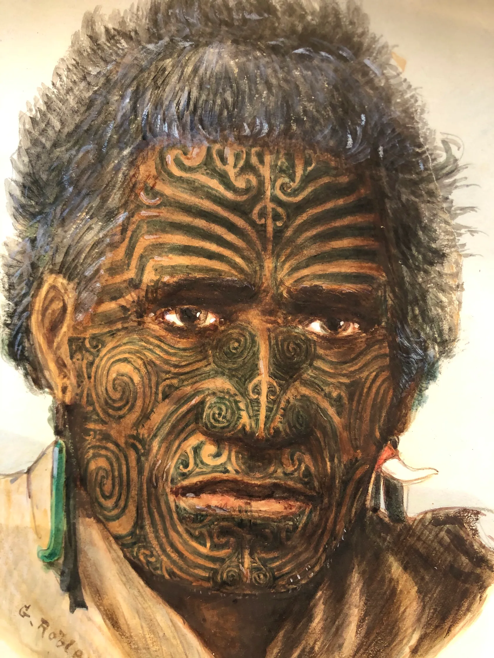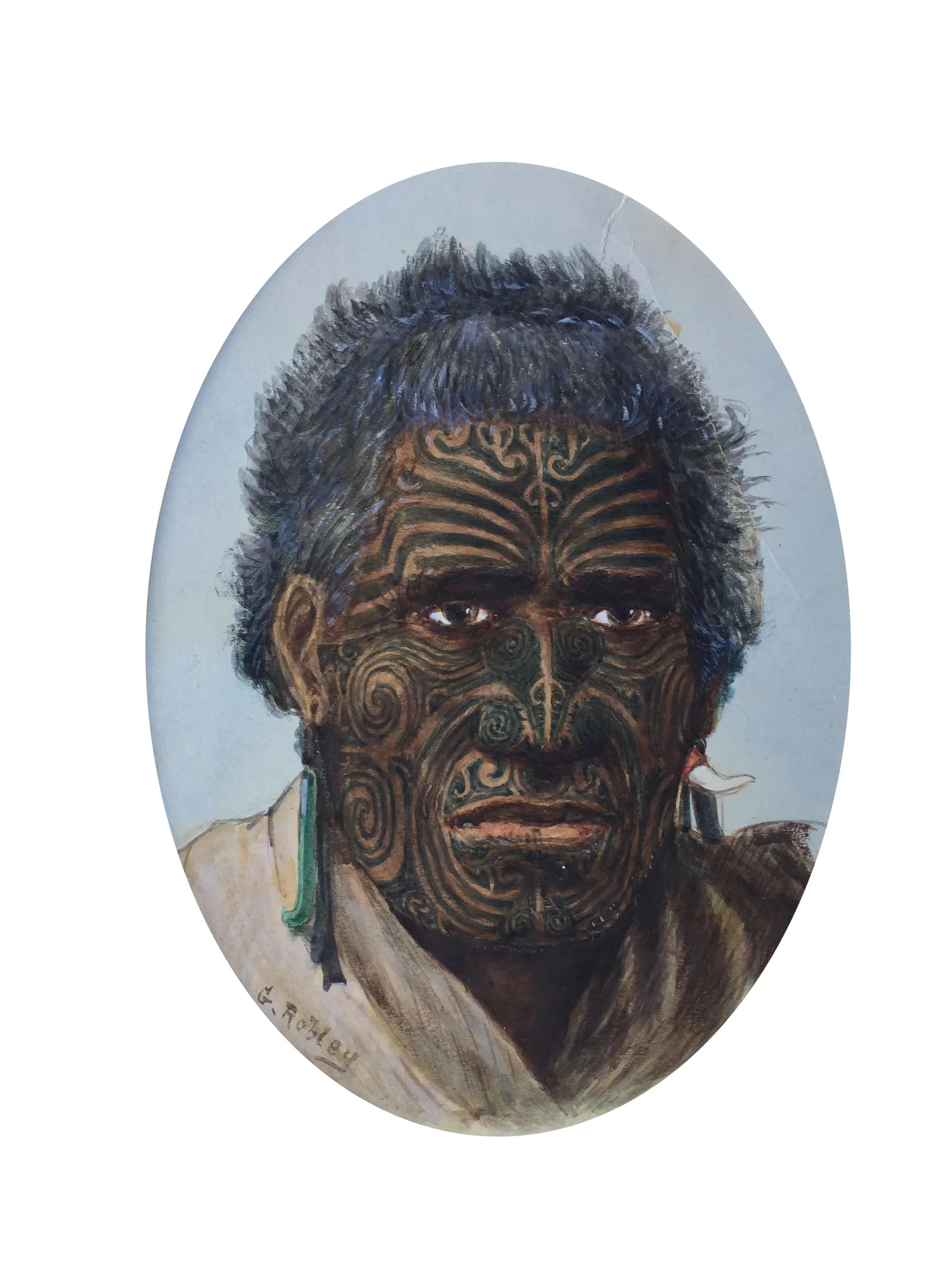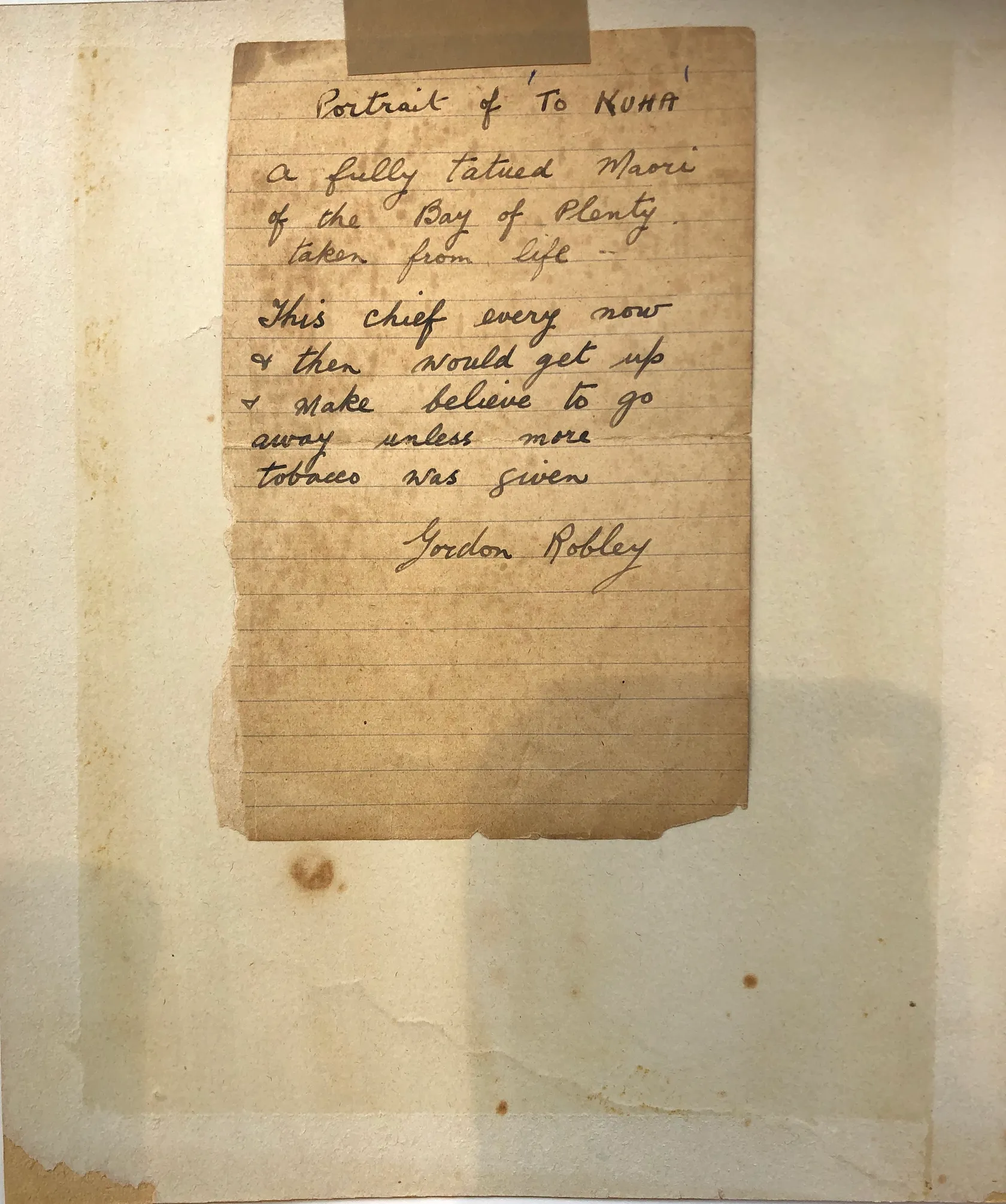 Watercolour - Inscription on label affixed verso reads: Portrait of Te Kuha. A fully tatued Maori of the Bay of Plenty taken from life. This chief every now and then would get up and make believe to go away unless more tobacco was given. Gordon Robley