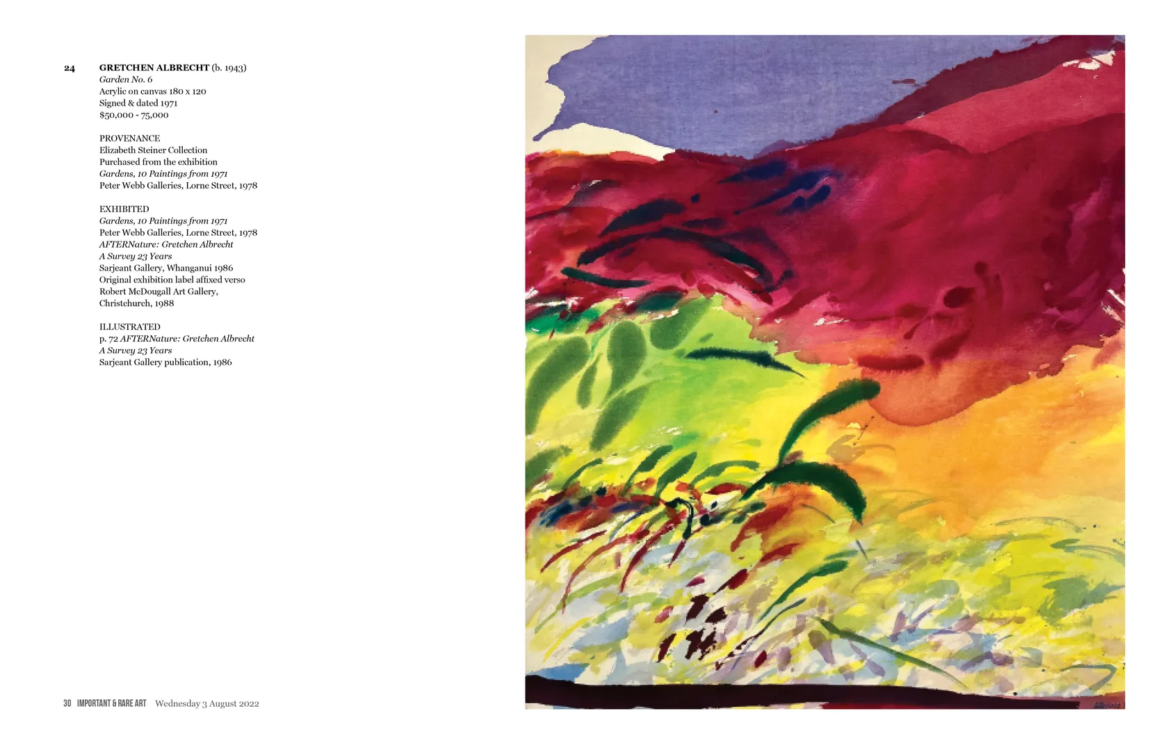 Gardens, 10 Paintings from 1971 Peter Webb Galleries, Lorne Street, 1978 AFTERNature: Gretchen Albrecht A Survey 23 Years Sarjeant Gallery, Whanganui 1986 Original exhibition label affixed verso Robert McDougall Art Gallery, Christchurch, 1988