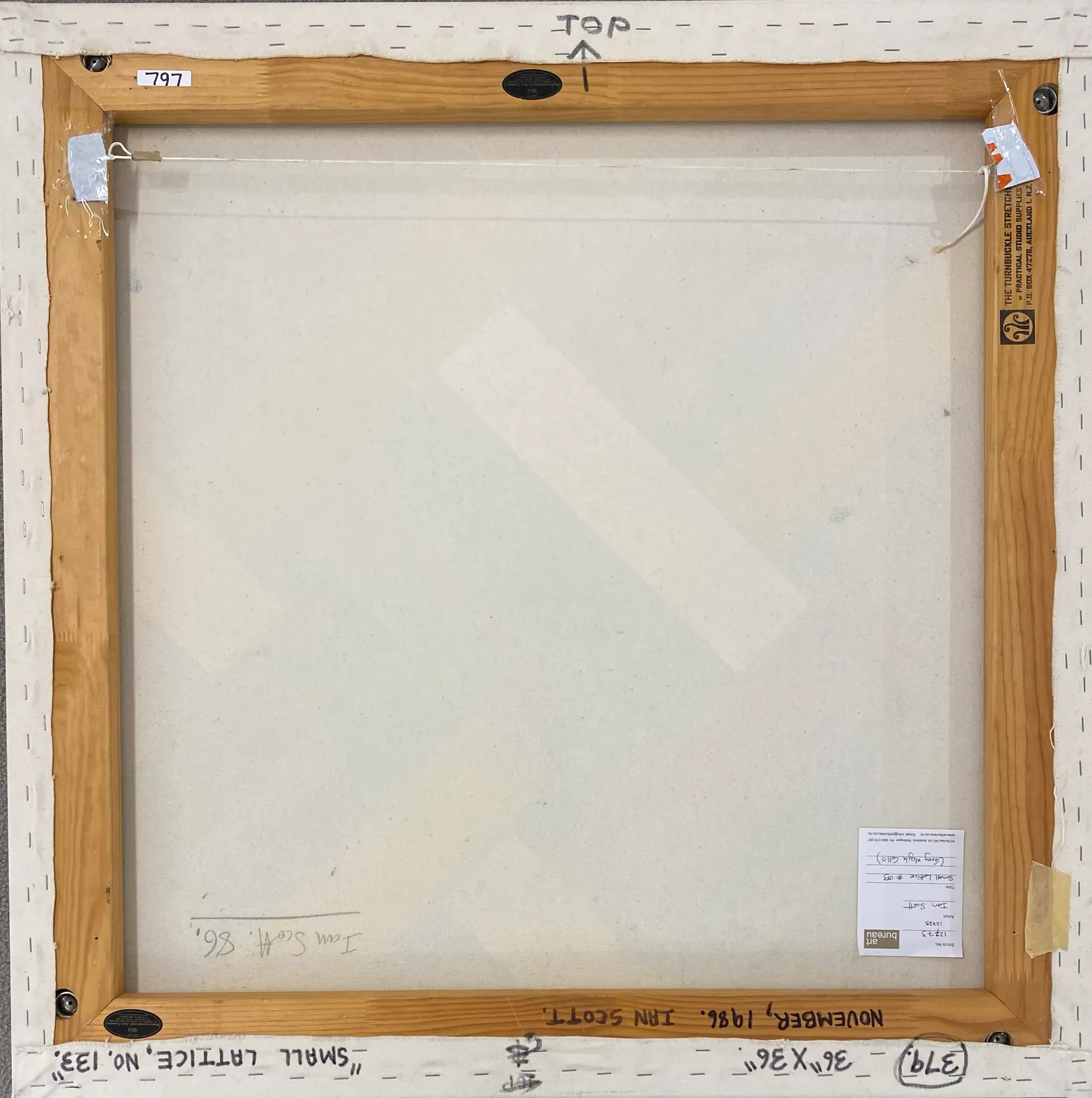 Signed, inscribed Small Lattice No. 133 & dated November 1986 on stretcher verso