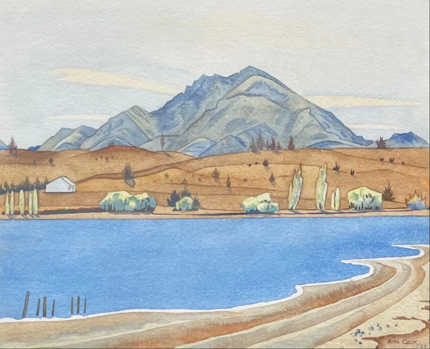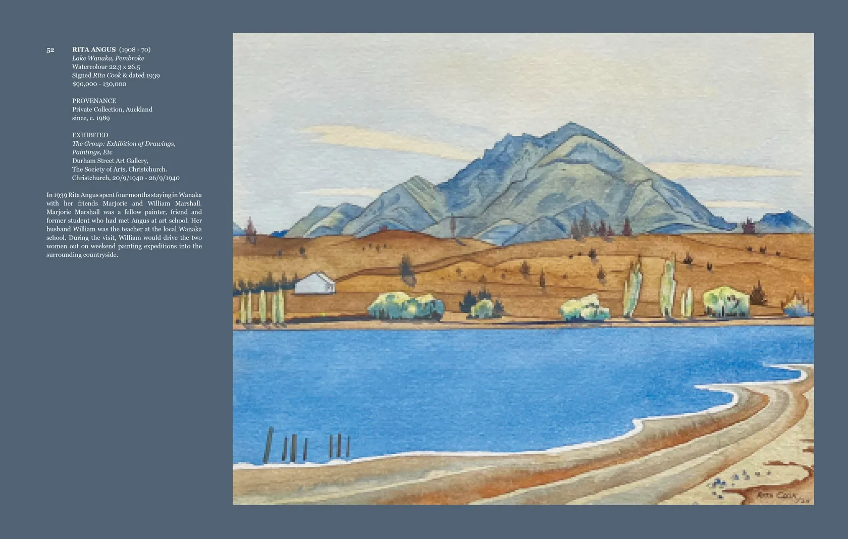 In 1939, Rita Angus spent four months staying in Wanaka with her friends Marjorie and William Marshall. Marjorie Marshall was a fellow painter, fri and former student who had met Angus at art school. Her husband William was the teacher at the local Wanaka school. During the visit, William would drive the two women out on weekend painting expeditions into the surrounding countryside. Although we belive this work was cat. no. 88 in the 1940 Group Show, the accompaning catalogue, of which there is a facsimile copy attached, did not include photographic reproductions. Lake Wanaka, Pembroke was exhibited with The Group in 1940.