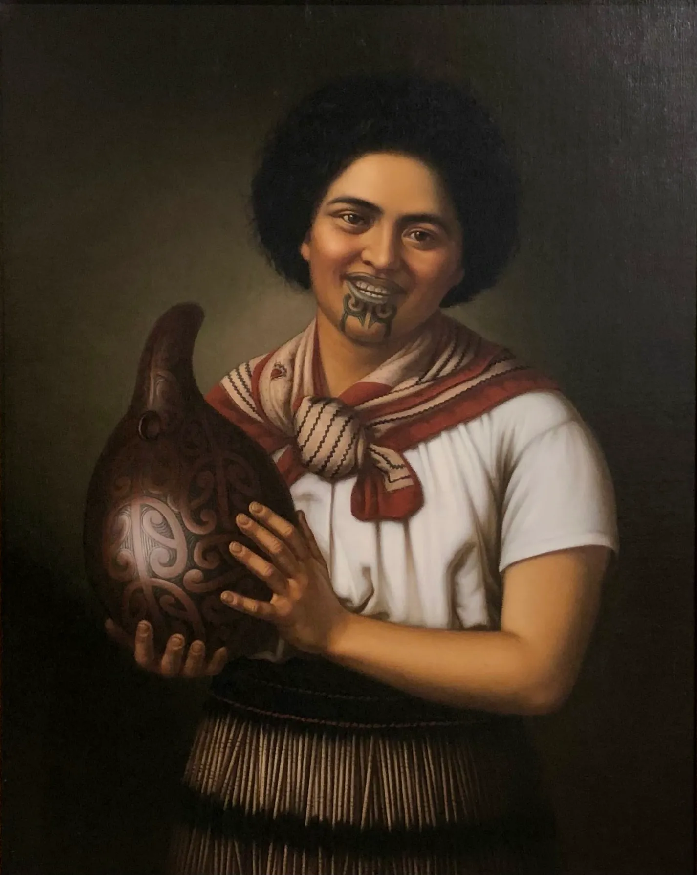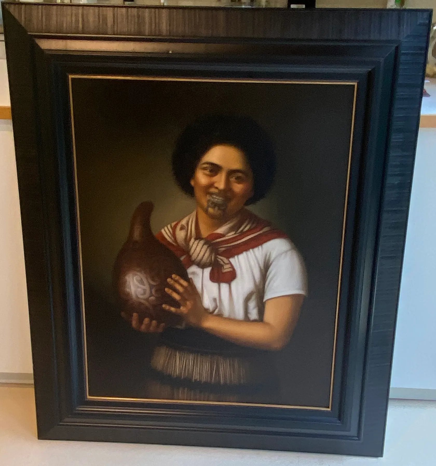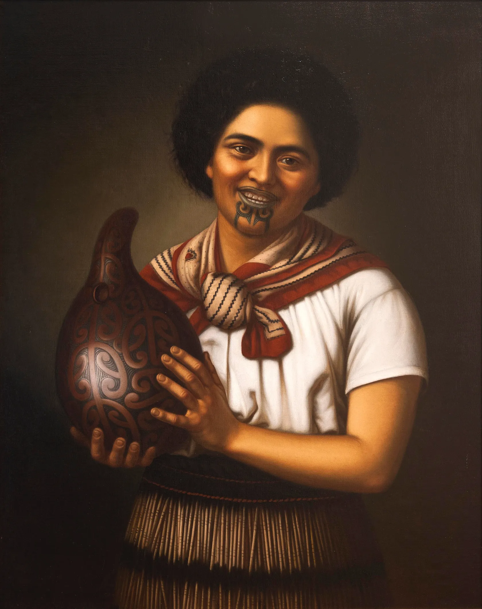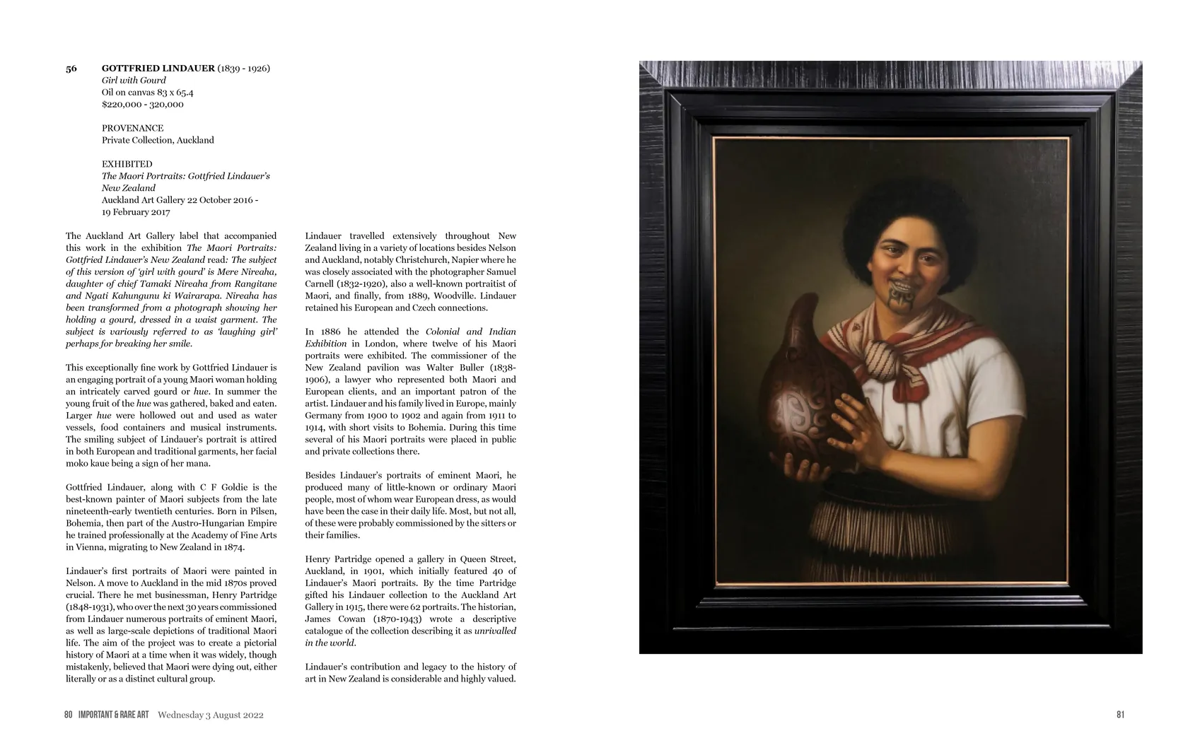 The Auckland Art Gallery label that accompanied this work in the exhibition The Maori Portraits: Gottfried Lindauer’s New Zealand read: The subject of this version of ‘girl with gourd’ is Mere Nireaha, daughter of chief Tamaki Nireaha from Rangitane and Ngati Kahungunu ki Wairarapa. Nireaha has been transformed from a photograph showing her holding a gourd, dressed in a waist garment. The subject is variously referred to as ‘laughing girl’ perhaps for breaking her smile. This exceptionally fine work by Gottfried Lindauer is an engaging portrait of a young Maori woman holding an intricately carved gourd or hue. In summer the young fruit of the hue was gathered, baked and eaten. Larger hue were hollowed out and used as water vessels, food containers and musical instruments. The smiling subject of Lindauer’s portrait is attired in both European and traditional garments, her facial moko kaue being a sign of her mana. Gottfried Lindauer, along with C F Goldie is the best-known painter of Maori subjects from the late nineteenth-early twentieth centuries. Born in Pilsen, Bohemia, then part of the Austro-Hungarian Empire he trained professionally at the Academy of Fine Arts in Vienna, migrating to New Zealand in 1874. Lindauer’s first portraits of Maori were painted in Nelson. A move to Auckland in the mid 1870s proved crucial. There he met businessman, Henry Partridge (1848-1931), who over the next 30 years commissioned from Lindauer numerous portraits of eminent Maori, as well as large-scale depictions of traditional Maori life. The aim of the project was to create a pictorial history of Maori at a time when it was widely, though mistakenly, believed that Maori were dying out, either literally or as a distinct cultural group. Lindauer travelled extensively throughout New Zealand living in a variety of locations besides Nelson and Auckland, notably Christchurch, Napier where he was closely associated with the photographer Samuel Carnell (1832-1920), also a well-known portraitist of Maori, and finally, from 1889, Woodville. Lindauer retained his European and Czech connections. In 1886 he attended the Colonial and Indian Exhibition in London, where twelve of his Maori portraits were exhibited. The commissioner of the New Zealand pavilion was Walter Buller (1838- 1906), a lawyer who represented both Maori and European clients, and an important patron of the artist. Lindauer and his family lived in Europe, mainly Germany from 1900 to 1902 and again from 1911 to 1914, with short visits to Bohemia. During this time several of his Maori portraits were placed in public and private collections there. Besides Lindaeur’s portraits of eminent Maori, he produced many of little-known or ordinary Maori people, most of whom wear European dress, as would have been the case in their daily life. Most, but not all, of these were probably commissioned by the sitters or their families. Henry Partridge opened a gallery in Queen Street, Auckland, in 1901, which initially featured 40 of Lindauer’s Maori portraits. By the time Partridge gifted his Lindauer collection to the Auckland Art Gallery in 1915, there were 62 portraits. The historian, James Cowan (1870-1943) wrote a descriptive catalogue of the collection describing it as unrivalled in the world. Lindauer’s contribution and legacy to the history of art in New Zealand is considerable and highly valued.