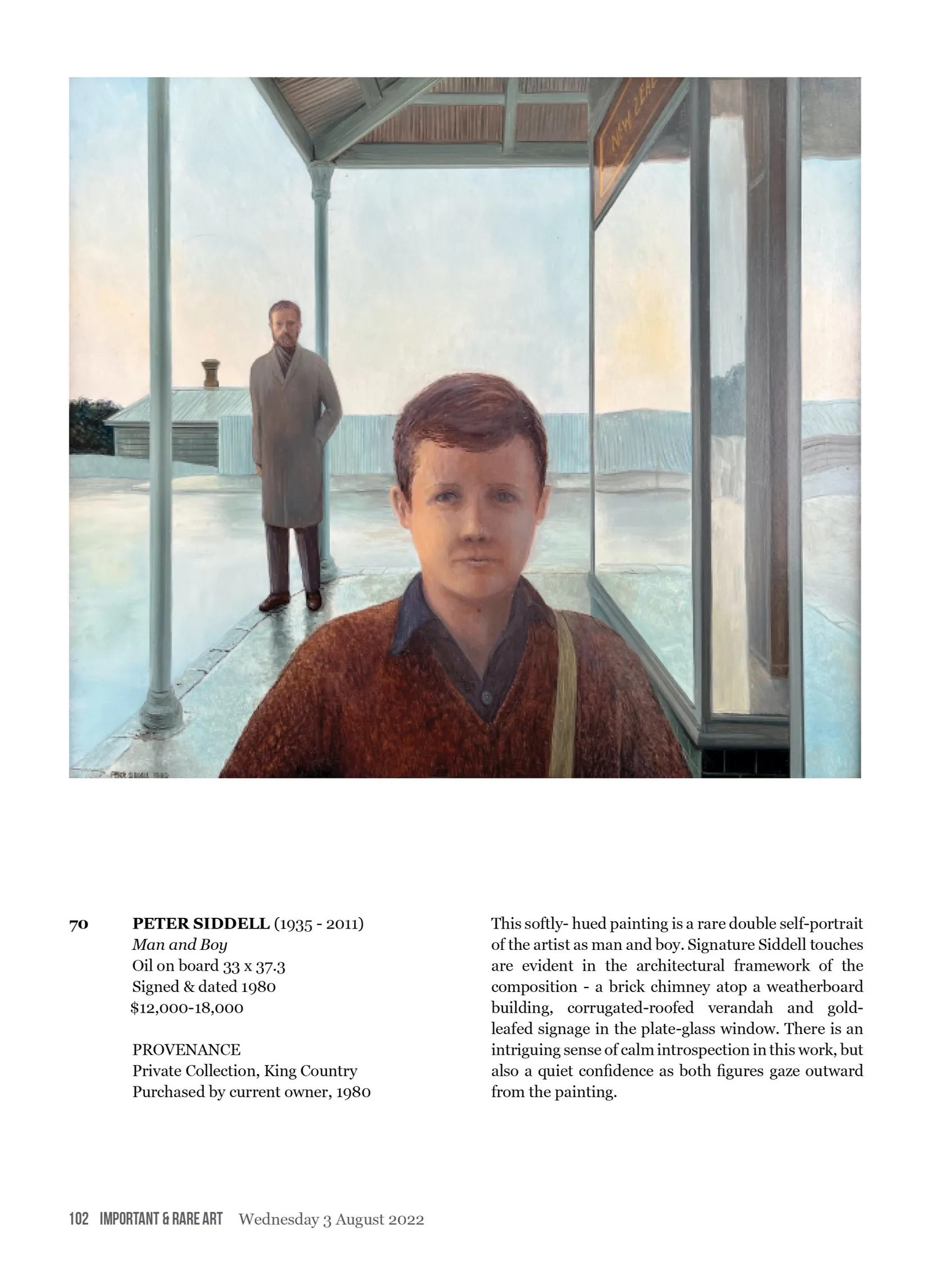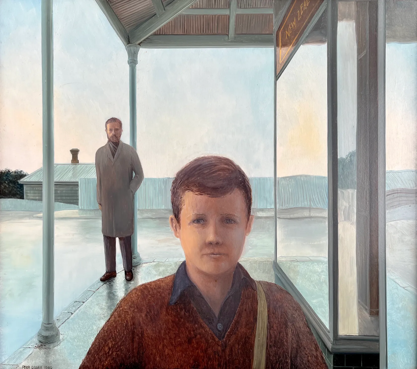 This softly- hued painting is a rare double self-portrait of the artist as man and boy. Signature Siddell touches are evident in the architectural framework of the composition - a brick chimney atop a weatherboard building, corrugated-roofed verandah and gold- leafed signage in the plate-glass window. There is an intriguing sense of calm introspection in this work, but also a quiet confidence as both figures gaze outward from the painting.