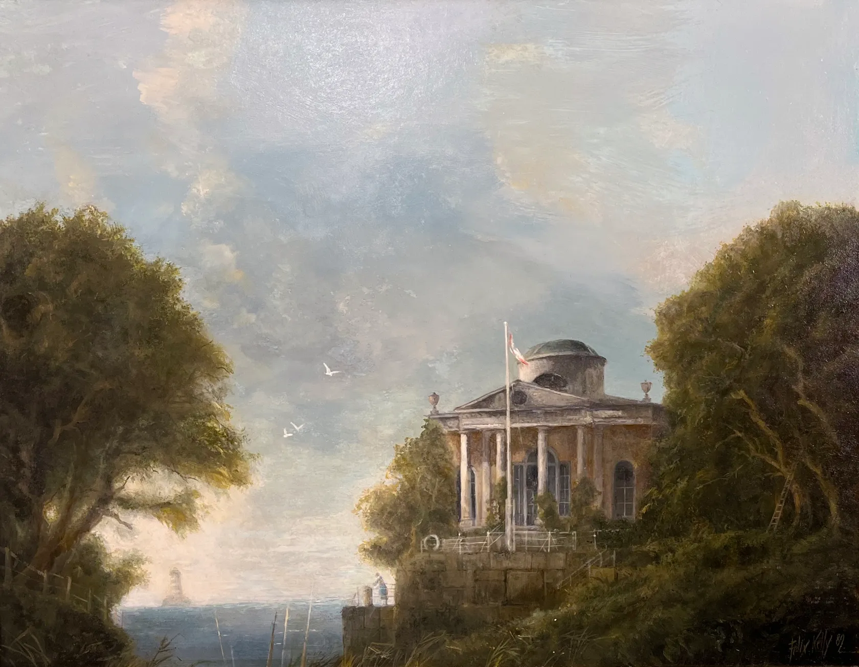 Felix Kelly is one of New Zealand’s most interesting expatriate artists. Born in Epsom in 1914 he claimed to be two years younger most of his adult life. Kelly studied briefly, and even seems to have taught drafting at Elam School of Fine Art. He was only 21 when he left New Zealand in 1935. He never returned. In London Kelly continued his New Zealand occupation of graphic design, working for Lintas, the advertising wing of Unilevers. He also freelanced as an illustrator and cartoonist, especially for Lilliput. His cartoons are not unlike those of the slightly younger Ronald Searle. After the war and the RAF, the focus of his graphic art shifted to book illustration, dust-jacket design and contributions on interior decoration to such fashion magazines as Ideal Home and Harper’s Bazaar. In the 1950s and 60s he was acknowledged as one of England’s top designers for the theatre, working with the likes of Sir John Gielgud and Dame Sybil Thorndike. Kelly’s ambition had always been to succeed as a painter. Emerging in the context of Surrealism and British Neo-Romanticism, he exhibited alongside important British artists such as Lucian Freud, John Piper and fellow New Zealander Frances Hodgkins. He attracted the attention of the prominent critic and writer, Herbert Read. Kelly’s paintings are characterised by his interest in a world forgotten by progress, great houses falling into dilapidation, windblasted trees, abandoned locomotives often invested with an eerie watchfulness. Rapidly, Kelly assembled a client list resembling a page from Who’s Who or De Brett’s. In late career, his knowledge of architecture led to involvement in house design, most notably his collaboration on the redesign of Highgrove for the Prince of Wales. His most celebrated project was, however, the mural cycle at Castle Howard associated with the filming of Brideshead Revisited in the 1980s. Kelly travelled a great deal. Paintings of Spain and Italy in the 1940s were followed by West African scenes in the 50s and ante-bellum houses in America’s Deep South in the 60s and 70s. Trips to Russia, Thailand, India and Egypt in the 70s and 80s each led to an exhibition of exotic paintings. In late career, Kelly would execute a small sketch characterised by loose brush-work, which would then be converted into a carefully executed big-scale painting. Both types of work appear for sale from time to time. Kelly completed paintings of Auckland subjects done decades after he had left home. Auckland’s West Coast beaches or Takapuna with Rangitoto beyond, or paddle-steamers on the Waitemata, were evoked with an increasing degree of fantasy well into the 1960s. A quirky humour pervades his work. Felix Kelly has to be one of New Zealand’s most individual artistic exports. A comprehensive exhibition of his earlier work, curated by Douglas Lloyd Jenkins and mounted by the Hawke’s Bay Museum and Art Gallery, toured several New Zealand centres in 2008-09. A second edition of Donald Bassett’s book Fix; The Art and Life of Felix Kelly, was published in 2013.