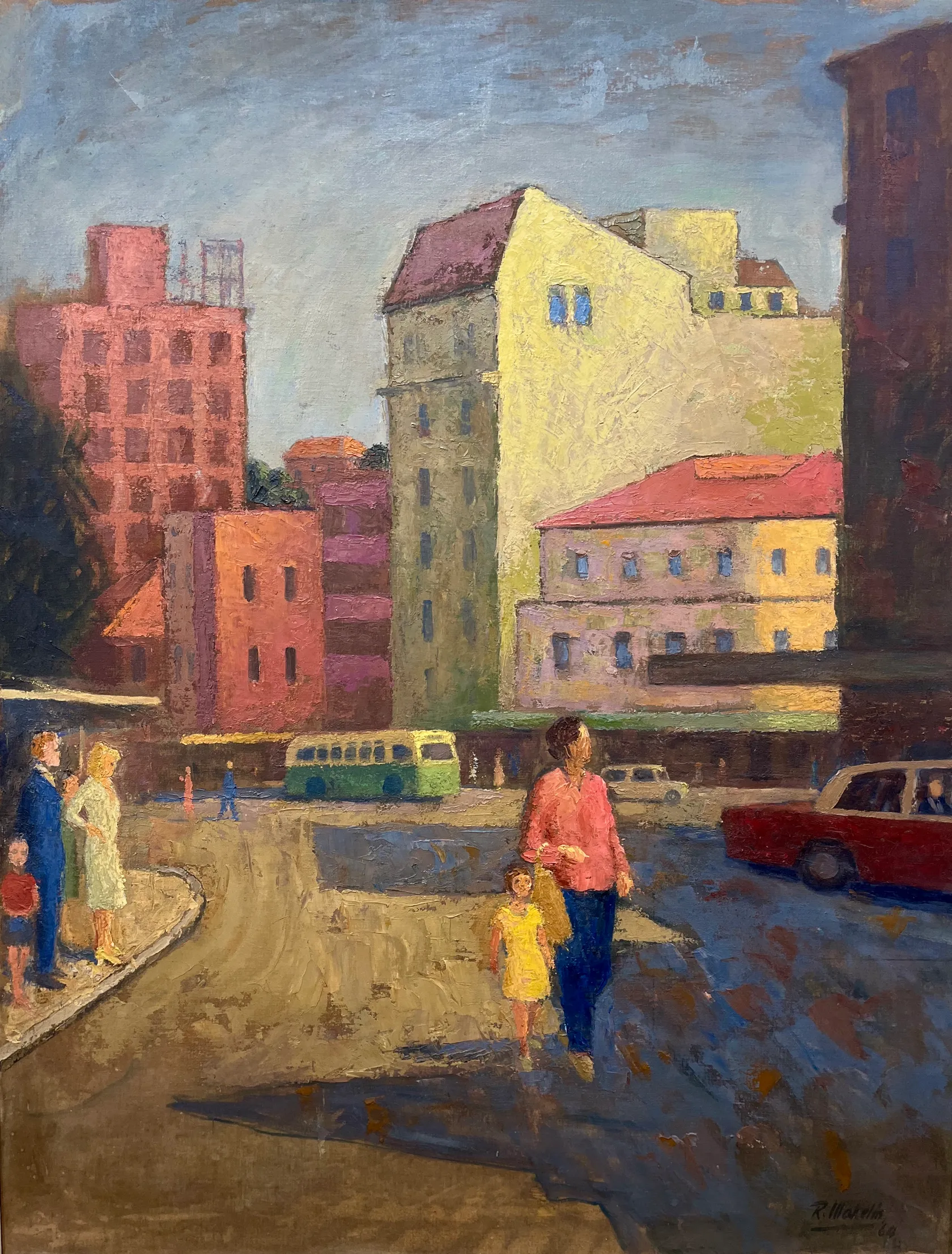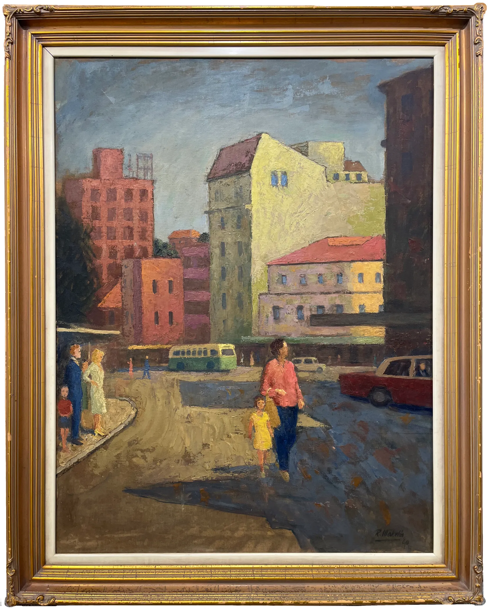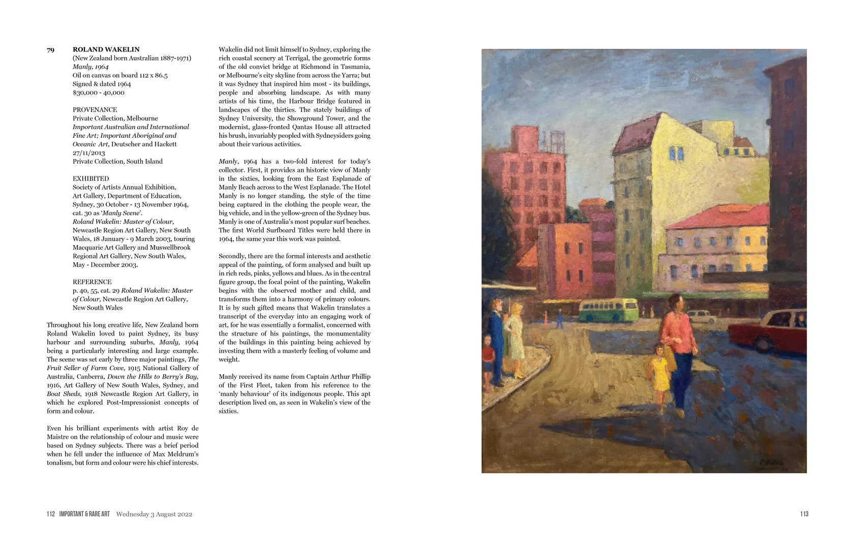 Throughout his long creative life, New Zealand born Roland Wakelin loved to paint Sydney, its busy harbour and surrounding suburbs, Manly, 1964 being a particularly interesting and large example. The scene was set early by three major paintings, The Fruit Seller of Farm Cove, 1915 National Gallery of Australia, Canberra, Down the Hills to Berry’s Bay, 1916, Art Gallery of New South Wales, Sydney, and Boat Sheds, 1918 Newcastle Region Art Gallery, in which he explored Post-Impressionist concepts of form and colour. Even his brilliant experiments with artist Roy de Maistre on the relationship of colour and music were based on Sydney subjects. There was a brief period when he fell under the influence of Max Meldrum’s tonalism, but form and colour were his chief interests. Wakelin did not limit himself to Sydney, exploring the rich coastal scenery at Terrigal, the geometric forms of the old convict bridge at Richmond in Tasmania, or Melbourne’s city skyline from across the Yarra; but it was Sydney that inspired him most - its buildings, people and absorbing landscape. As with many artists of his time, the Harbour Bridge featured in landscapes of the thirties. The stately buildings of Sydney University, the Showground Tower, and the modernist, glass-fronted Qantas House all attracted his brush, invariably peopled with Sydneysiders going about their various activities. Manly, 1964 has a two-fold interest for today’s collector. First, it provides an historic view of Manly in the sixties, looking from the East Esplanade of Manly Beach across to the West Esplanade. The Hotel Manly is no longer standing, the style of the time being captured in the clothing the people wear, the big vehicle, and in the yellow-green of the Sydney bus. Manly is one of Australia’s most popular surf beaches. The first World Surfboard Titles were held there in 1964, the same year this work was painted. Secondly, there are the formal interests and aesthetic appeal of the painting, of form analysed and built up in rich reds, pinks, yellows and blues. As in the central figure group, the focal point of the painting, Wakelin begins with the observed mother and child, and transforms them into a harmony of primary colours. It is by such gifted means that Wakelin translates a transcript of the everyday into an engaging work of art, for he was essentially a formalist, concerned with the structure of his paintings, the monumentality of the buildings in this painting being achieved by investing them with a masterly feeling of volume and weight. Manly received its name from Captain Arthur Phillip of the First Fleet, taken from his reference to the ‘manly behaviour’ of its indigenous people. This apt description lived on, as seen in Wakelin’s view of the sixties.