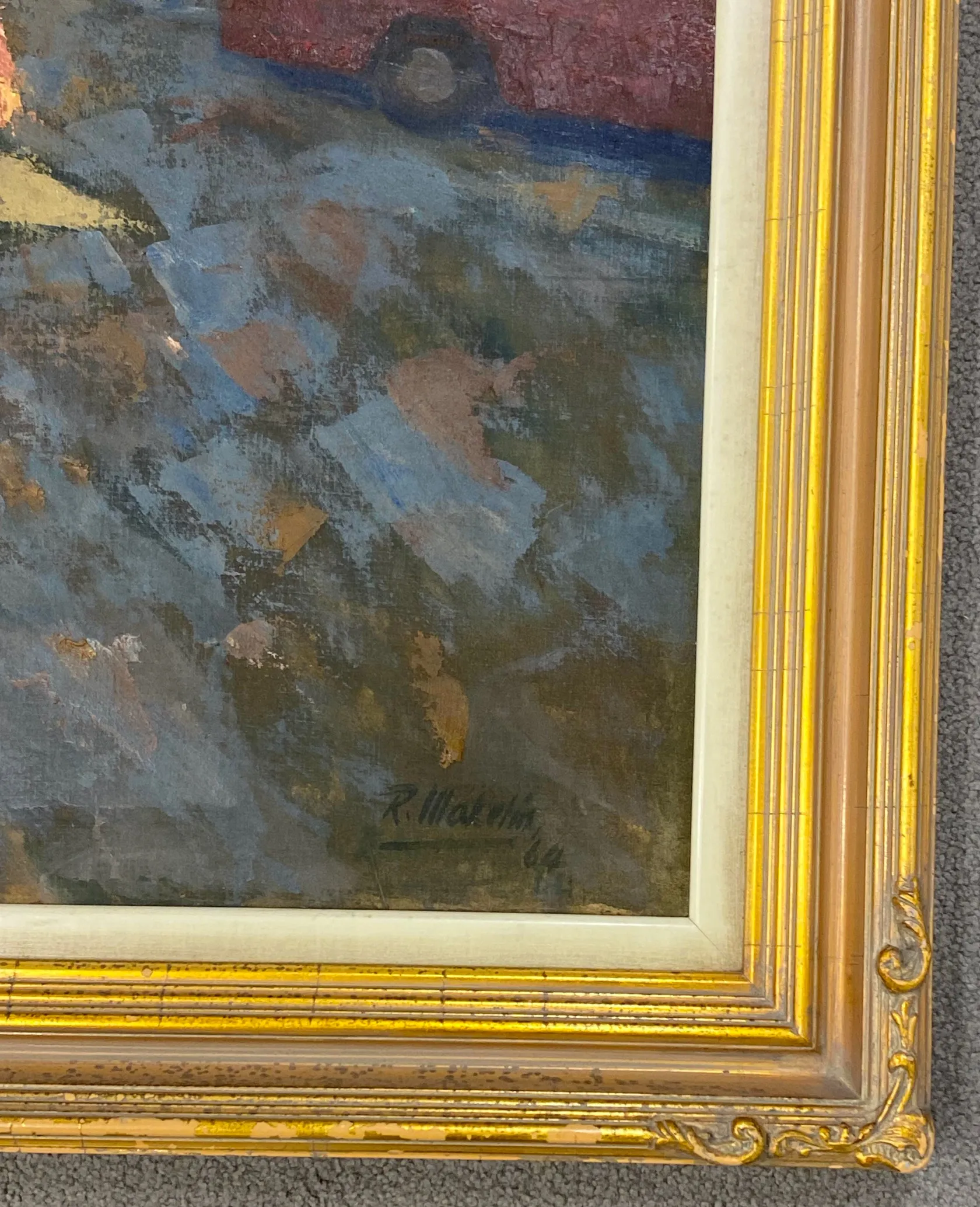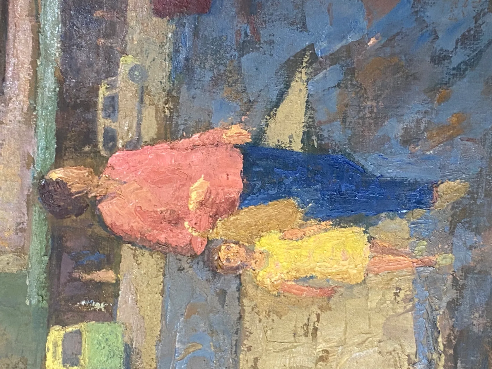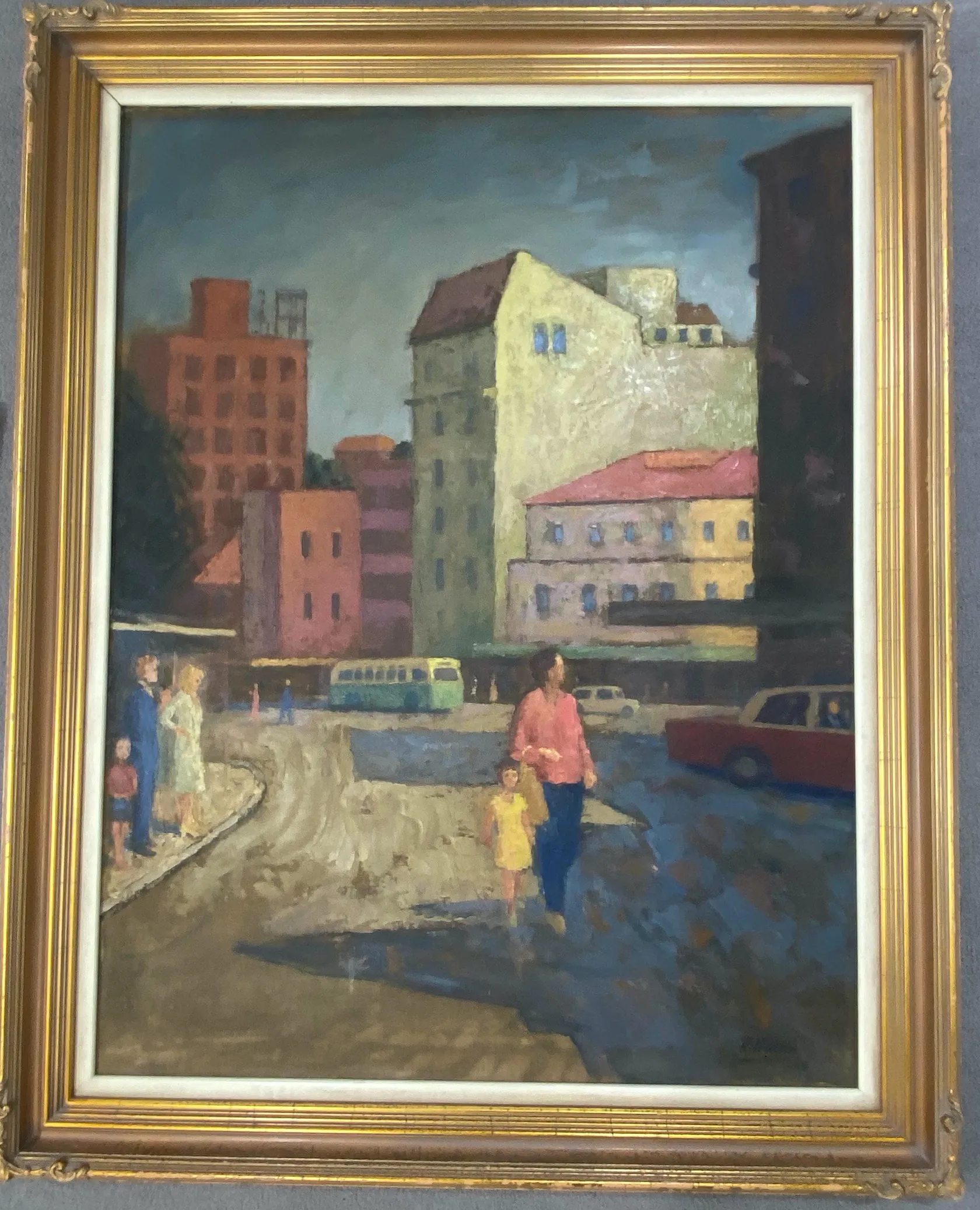 Throughout his long creative life, New Zealand born Roland Wakelin loved to paint Sydney, its busy harbour and surrounding suburbs, Manly, 1964 being a particularly interesting and large example. The scene was set early by three major paintings, The Fruit Seller of Farm Cove, 1915 National Gallery of Australia, Canberra, Down the Hills to Berry’s Bay, 1916, Art Gallery of New South Wales, Sydney, and Boat Sheds, 1918 Newcastle Region Art Gallery, in which he explored Post-Impressionist concepts of form and colour. Even his brilliant experiments with artist Roy de Maistre on the relationship of colour and music were based on Sydney subjects. There was a brief period when he fell under the influence of Max Meldrum’s tonalism, but form and colour were his chief interests. Wakelin did not limit himself to Sydney, exploring the rich coastal scenery at Terrigal, the geometric forms of the old convict bridge at Richmond in Tasmania, or Melbourne’s city skyline from across the Yarra; but it was Sydney that inspired him most - its buildings, people and absorbing landscape. As with many artists of his time, the Harbour Bridge featured in landscapes of the thirties. The stately buildings of Sydney University, the Showground Tower, and the modernist, glass-fronted Qantas House all attracted his brush, invariably peopled with Sydneysiders going about their various activities. Manly, 1964 has a two-fold interest for today’s collector. First, it provides an historic view of Manly in the sixties, looking from the East Esplanade of Manly Beach across to the West Esplanade. The Hotel Manly is no longer standing, the style of the time being captured in the clothing the people wear, the big vehicle, and in the yellow-green of the Sydney bus. Manly is one of Australia’s most popular surf beaches. The first World Surfboard Titles were held there in 1964, the same year this work was painted. Secondly, there are the formal interests and aesthetic appeal of the painting, of form analysed and built up in rich reds, pinks, yellows and blues. As in the central figure group, the focal point of the painting, Wakelin begins with the observed mother and child, and transforms them into a harmony of primary colours. It is by such gifted means that Wakelin translates a transcript of the everyday into an engaging work of art, for he was essentially a formalist, concerned with the structure of his paintings, the monumentality of the buildings in this painting being achieved by investing them with a masterly feeling of volume and weight. Manly received its name from Captain Arthur Phillip of the First Fleet, taken from his reference to the ‘manly behaviour’ of its indigenous people. This apt description lived on, as seen in Wakelin’s view of the sixties.