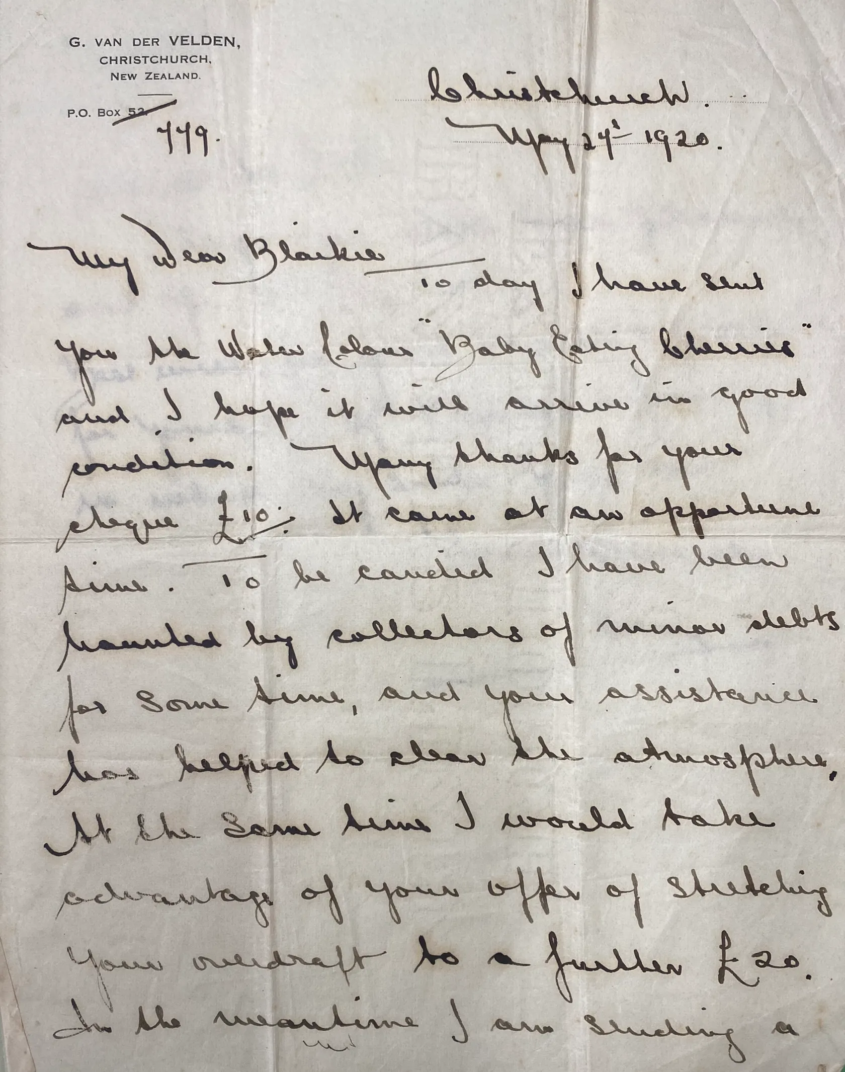 Collection of Walter Scott Blaikie, Timaru, friend of artist, by descent. Includes a letter form the artist to Mr Blaikie, dated 1920