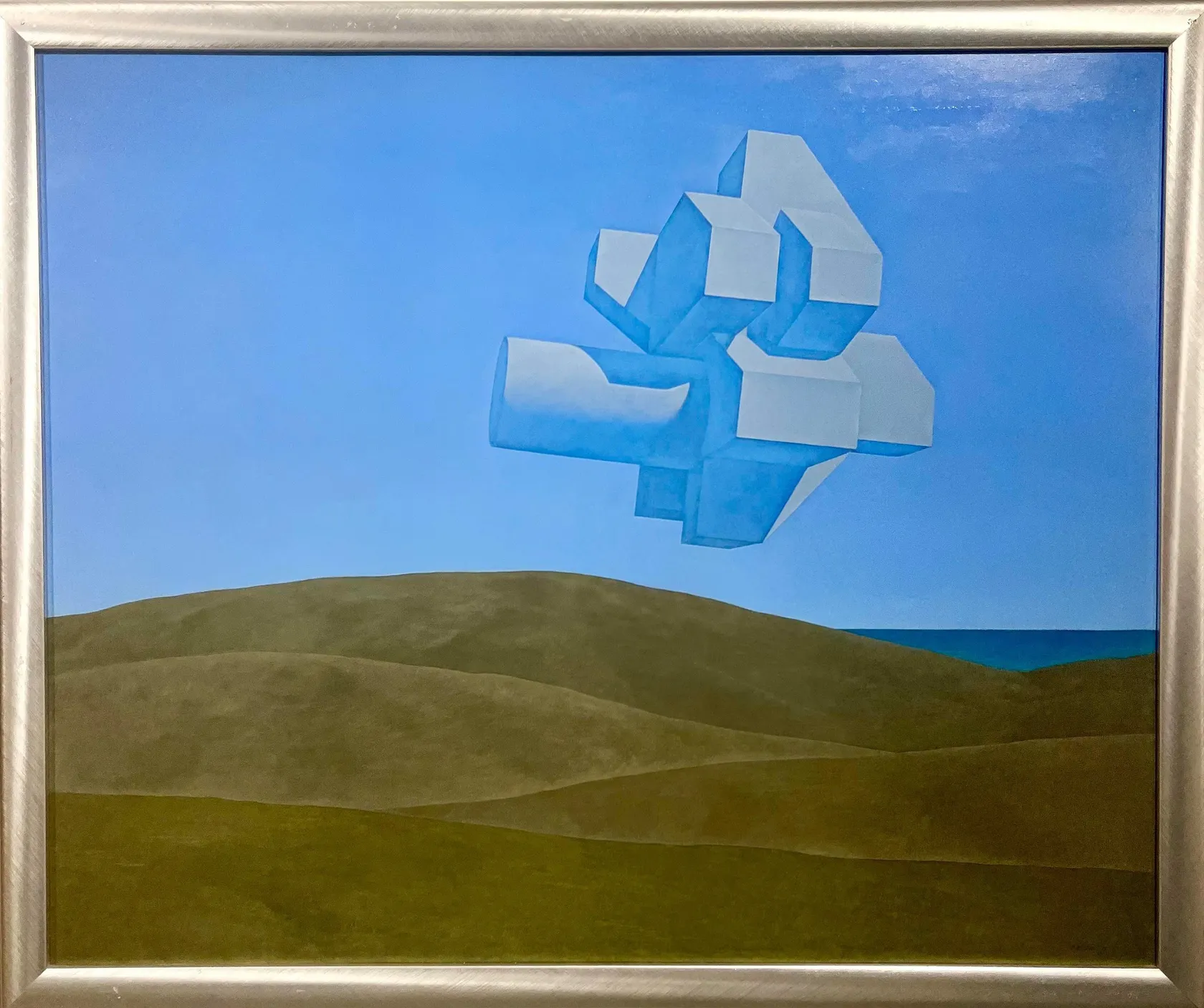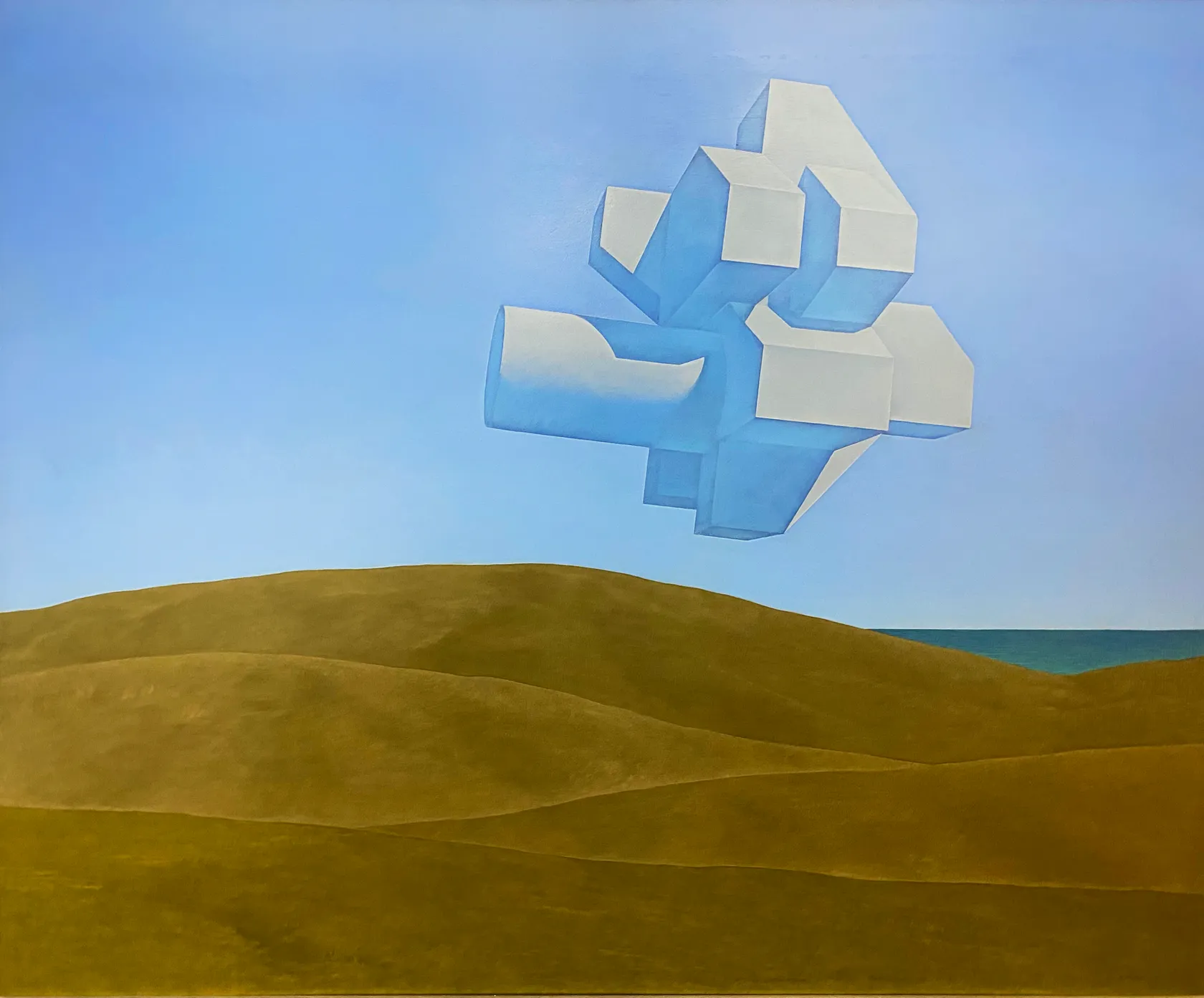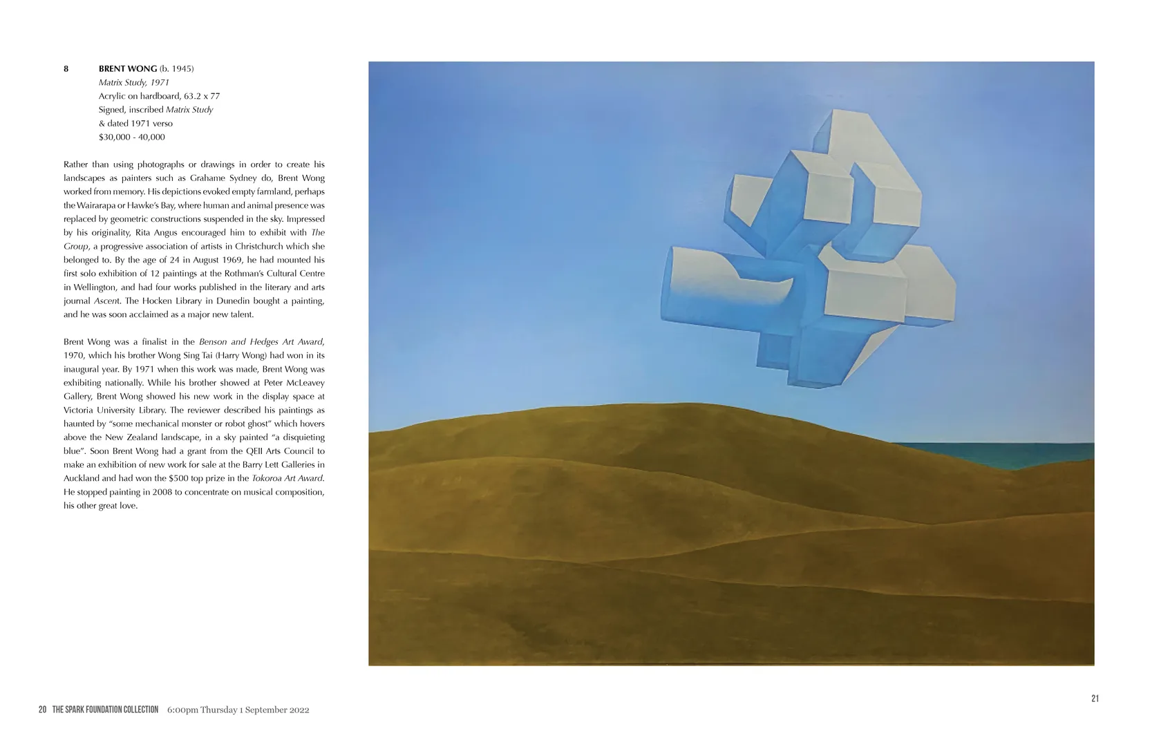 Rather than using photographs or drawings in order to create his landscapes as painters such as Grahame Sydney do, Brent Wong worked from memory. His depictions evoked empty farmland, perhaps the Wairarapa or Hawke’s Bay, where human and animal presence was replaced by geometric constructions suspended in the sky. Impressed by his originality, Rita Angus encouraged him to exhibit with The Group, a progressive association of artists in Christchurch which she belonged to. By the age of 24 in August 1969, he had mounted his first solo exhibition of 12 paintings at the Rothman’s Cultural Centre in Wellington, and had four works published in the literary and arts journal Ascent. The Hocken Library in Dunedin bought a painting, and he was soon acclaimed as a major new talent.