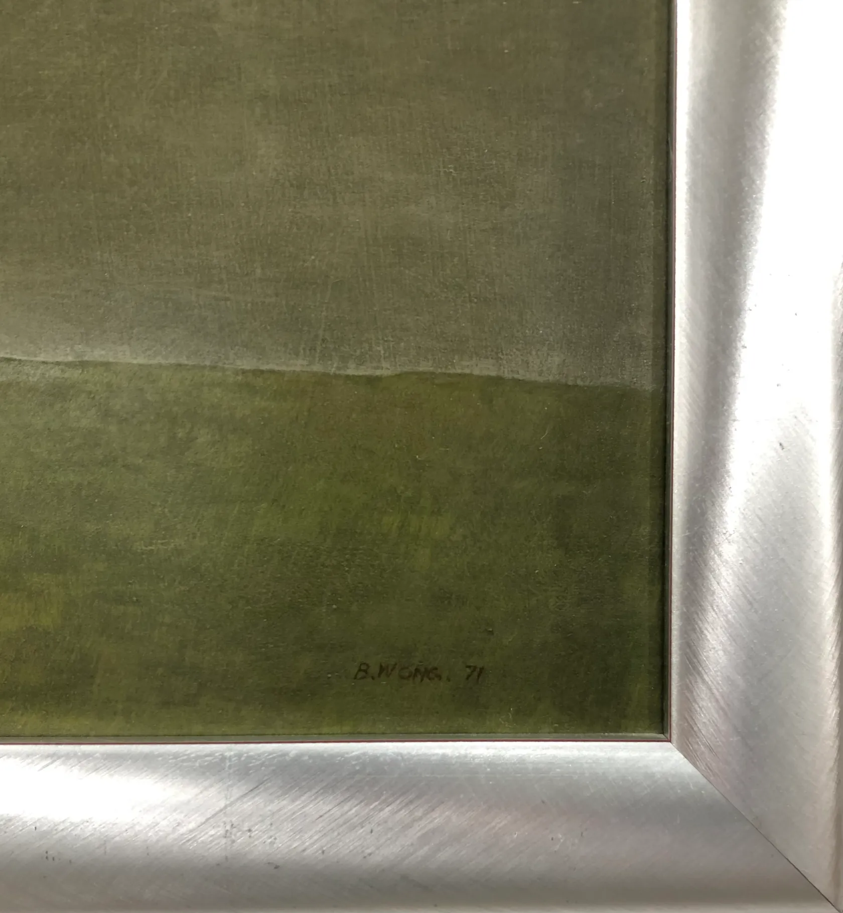 Brent Wong was a finalist in the Benson and Hedges Art Award, 1970, which his brother Wong Sing Tai (Harry Wong) had won in its inaugural year. By 1971 when this work was made, Brent Wong was exhibiting nationally. While his brother showed at Peter McLeavey Gallery, Brent Wong showed his new work in the display space at Victoria University Library. The reviewer described his paintings as haunted by “some mechanical monster or robot ghost” which hovers above the New Zealand landscape, in a sky painted “a disquieting blue”. Soon Brent Wong had a grant from the QEII Arts Council to make an exhibition of new work for sale at the Barry Lett Galleries in Auckland and had won the $500 top prize in the Tokoroa Art Award. He stopped painting in 2008 to concentrate on musical composition, his other great love.