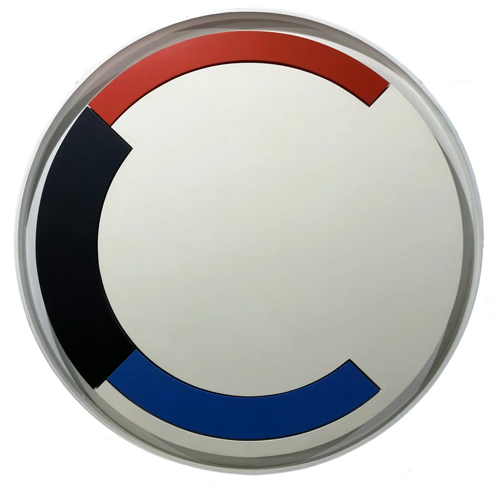 The curving arcs of blue, black and red around the periphery of the painting reinforce the round shape, but also draw attention to the edge of the work, setting it in motion for the viewer. Placed intuitively, these Bauhaus-like building blocks indicate the artist’s interest in colour as an element in painting that activates an emotional response. These operate in contrast to the action of the expanse of white which creates a still centre to the work, balancing the momentum of the curves.