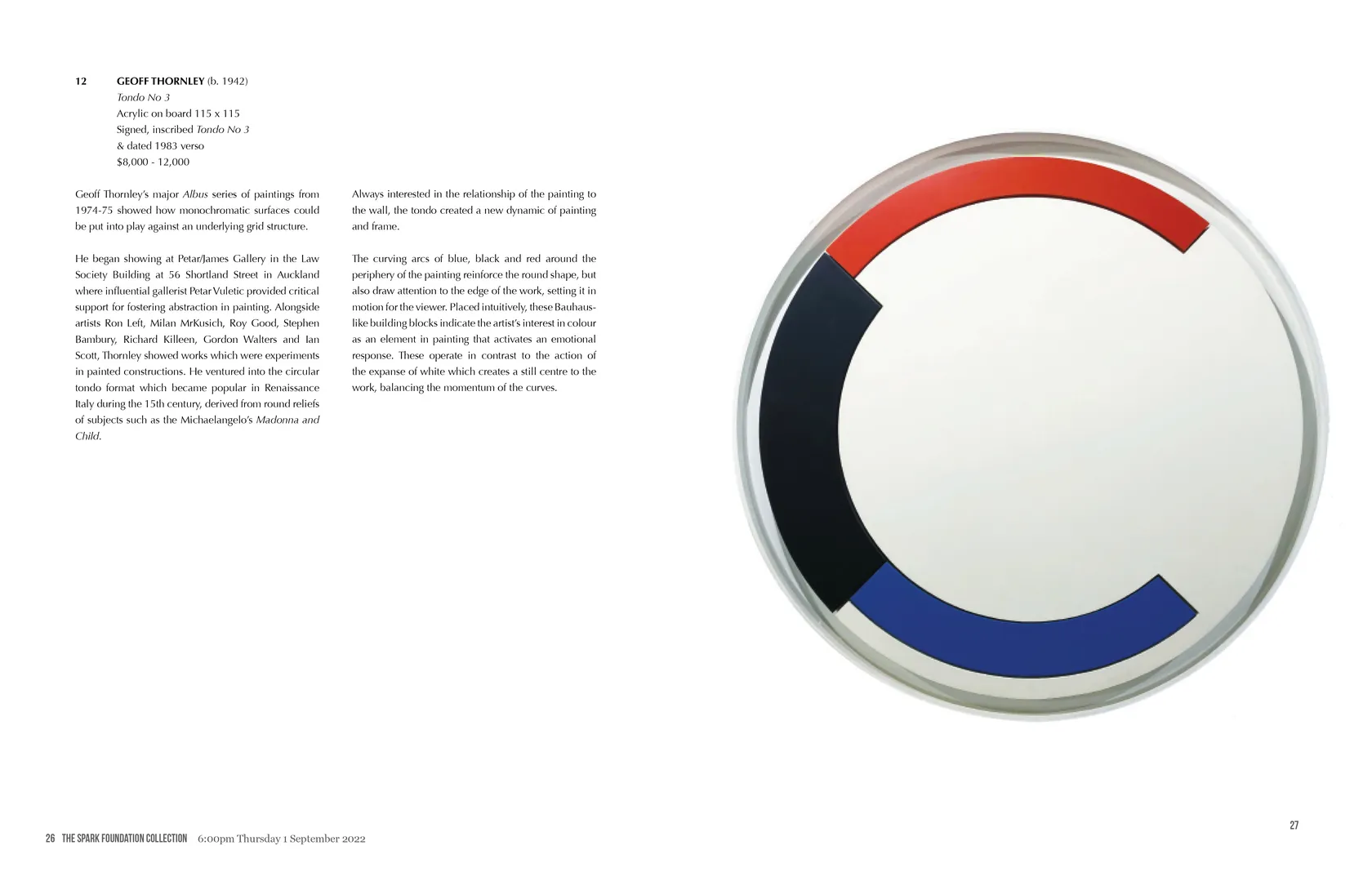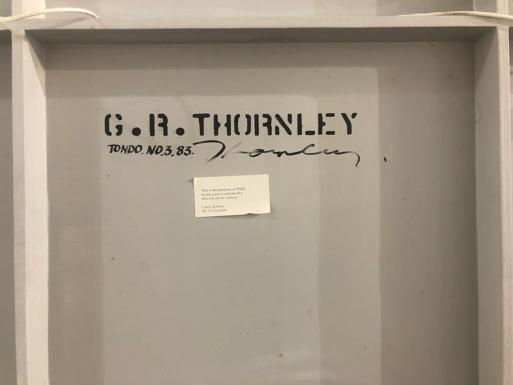 He began showing at Petar/James Gallery in the Law Society Building at 56 Shortland Street in Auckland where influential gallerist Petar Vuletic provided critical support for fostering abstraction in painting. Alongside artists Ron Left, Milan MrKusich, Roy Good, Stephen Bambury, Richard Killeen, Gordon Walters and Ian Scott, Thornley showed works which were experiments in painted constructions. He ventured into the circular tondo format which became popular in Renaissance Italy during the 15th century, derived from round reliefs of subjects such as the Michaelangelo’s Madonna and Child.