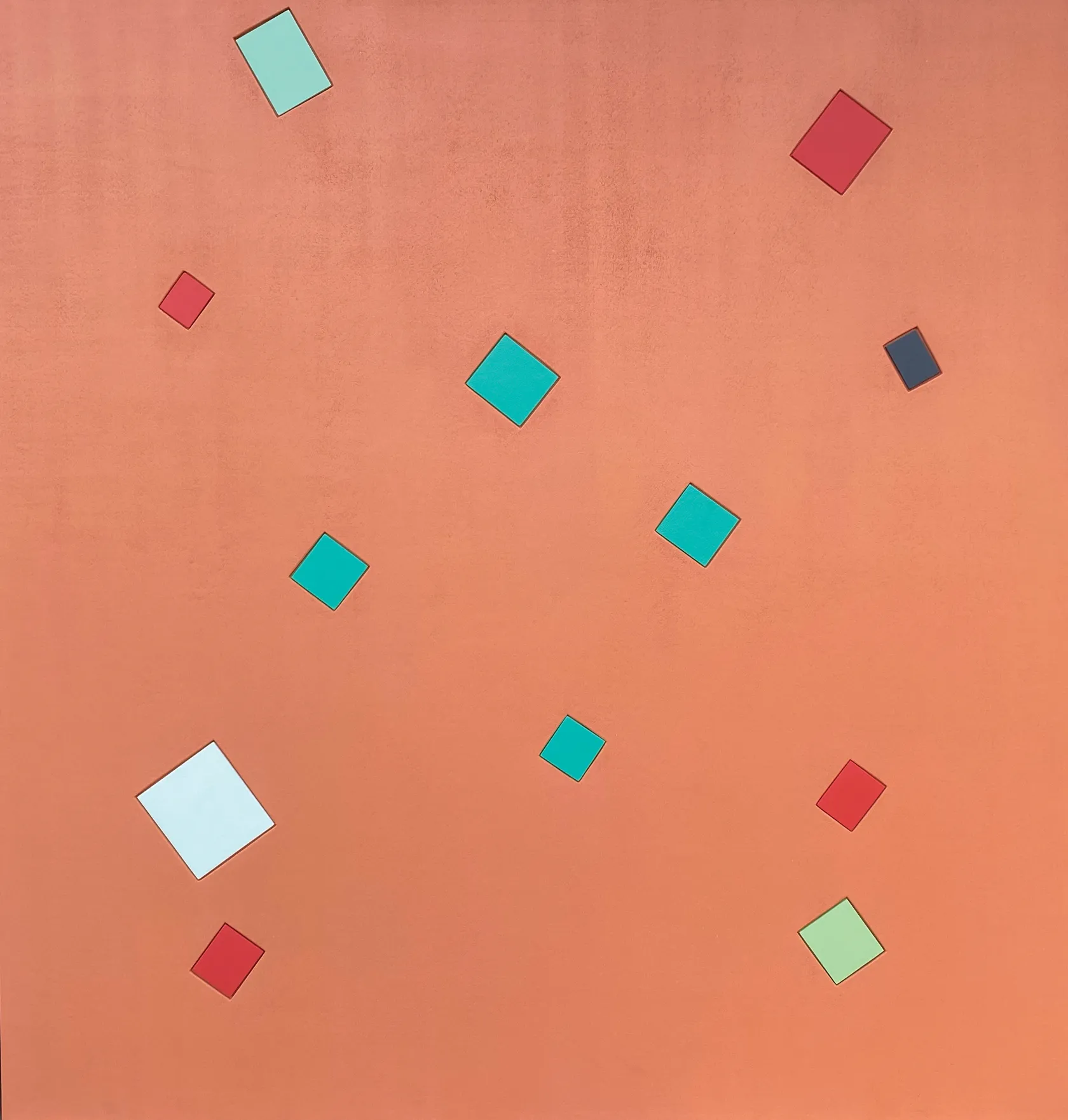 In this work, artist Geoff Thornley contrasts the pictorial and material aspects of the work. The small rectangles are cut into the pinky-orange substrate which provides the field of colour for the work. Like elements in a terrazzo floor, these bright geometric shapes activate the surface, enlivening it with jazzy patterns. Four darker green diamonds at the centre are complemented by blocks of red, arranged like the points of a kite on the diagonal across the work. Two lighter green rectangles counter this on the opposing diagonal access, matched by a smaller black rectangle and larger white square.