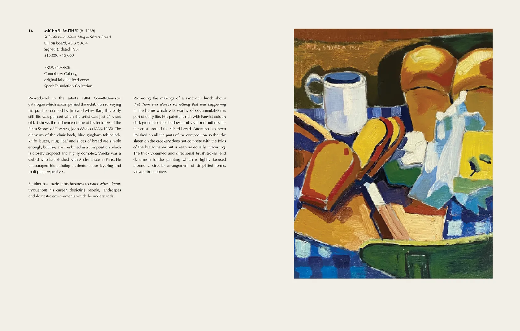 Reproduced in the artist’s 1984 Govett-Brewster catalogue which accompanied the exhibition surveying his practice curated by Jim and Mary Barr, this early still life was painted when the artist was just 21 years old. It shows the influence of one of his lecturers at the Elam School of Fine Arts, John Weeks (1886-1965). The elements of the chair back, blue gingham tablecloth, knife, butter, mug, loaf and slices of bread are simple enough, but they are combined in a composition which is closely cropped and highly complex. Weeks was a Cubist who had studied with Andre Lhote in Paris. He encouraged his painting students to use layering and multiple perspectives.