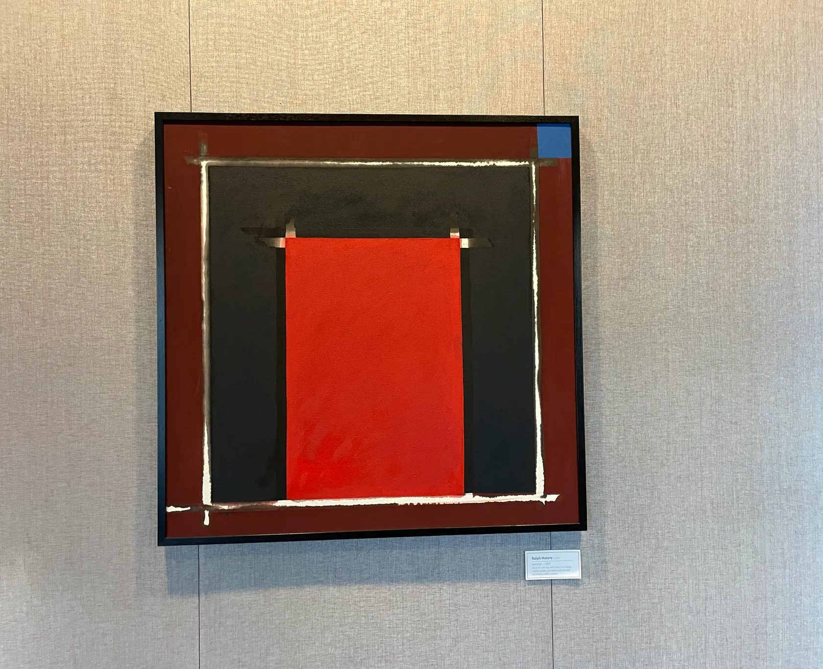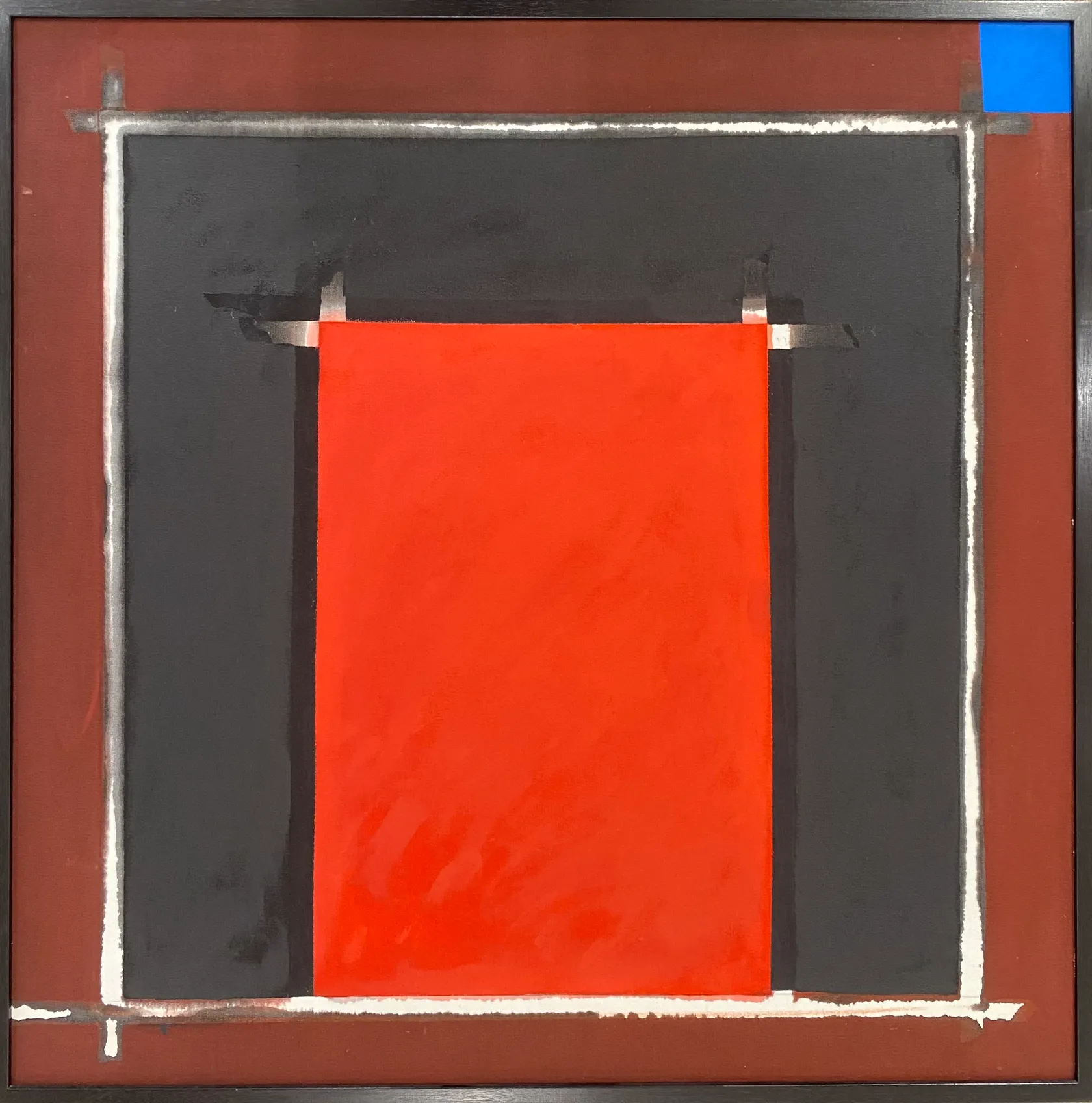 Windows are a frequent motif in Ralph Hotere’s work, carrying in their representation symbolic associations of illumination and hope. In 1997, the exhibition Out the Black Window curated by Gregory O’Brien for the City Gallery, toured nationally. With its focus on words and poetry in his art, it may have been the catalyst for Hotere creating this work as a return to pure painting. With its large white-framed black and small blue square set within a rust-coloured field, set off by the overlay of a bright red vertically-placed rectangle, this work appears like a series of windows with no transparency. Rather than offering a window on the world, it is a post-painterly abstraction: an exercise in establishing colour relationships, and the disruption of symmetry, without words.