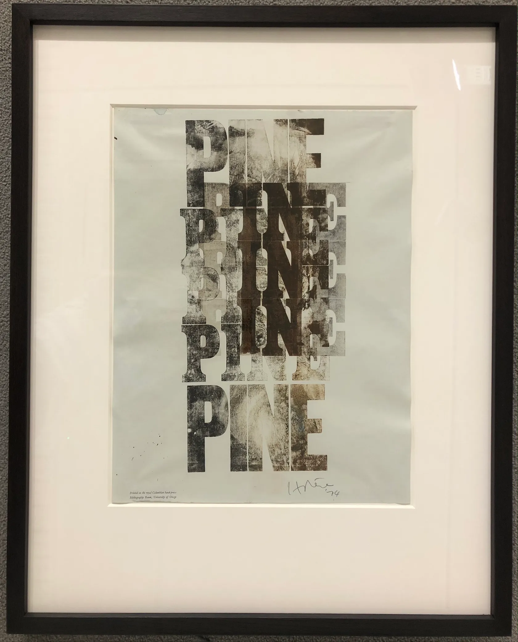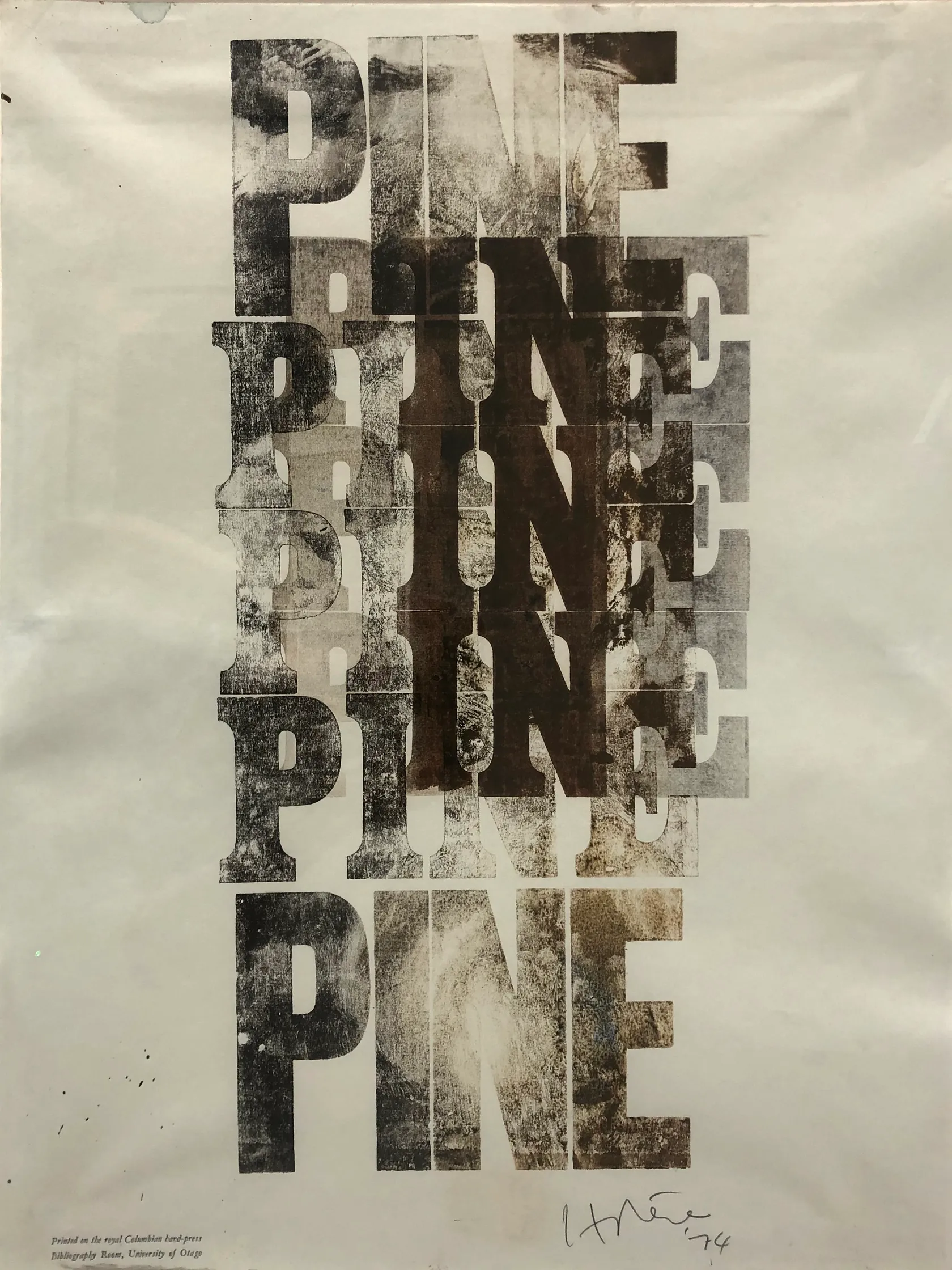 Two years later, in 1974, Hotere used the historic royal Columbian handpress in the Otakou Press room at the University of Otago Library to make a series of woodblock prints with ink annotations. Made by Thomas Long of Edinburgh about 1860, this press had been brought to Dunedin in the mid-1860s by Henry Wise and was used to print street directories. Hotere combines serif and sans serif fonts for the column of PINE, making it appear like a tree trunk. He has run each piece of paper through the press several times to get overprinting effects, which also make the word PINE appear like a sound poem, echoing across the lightly toned green paper.