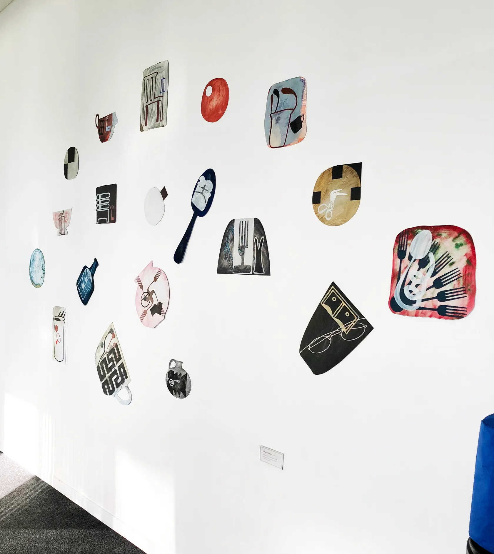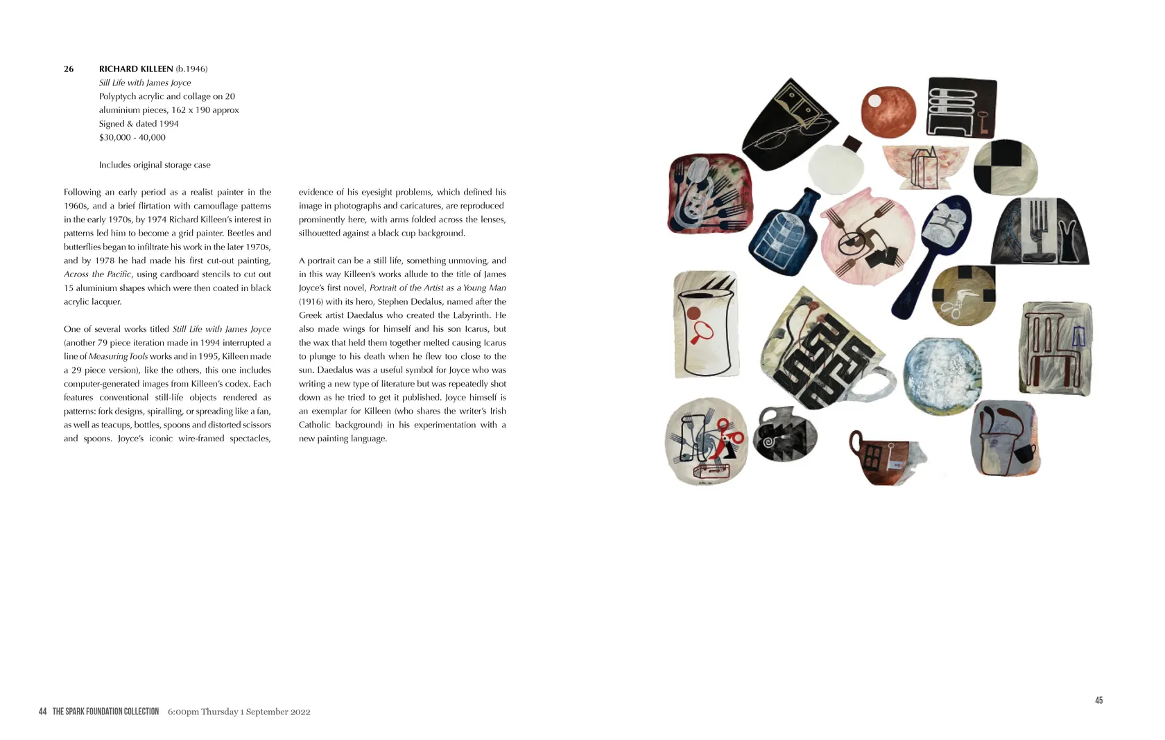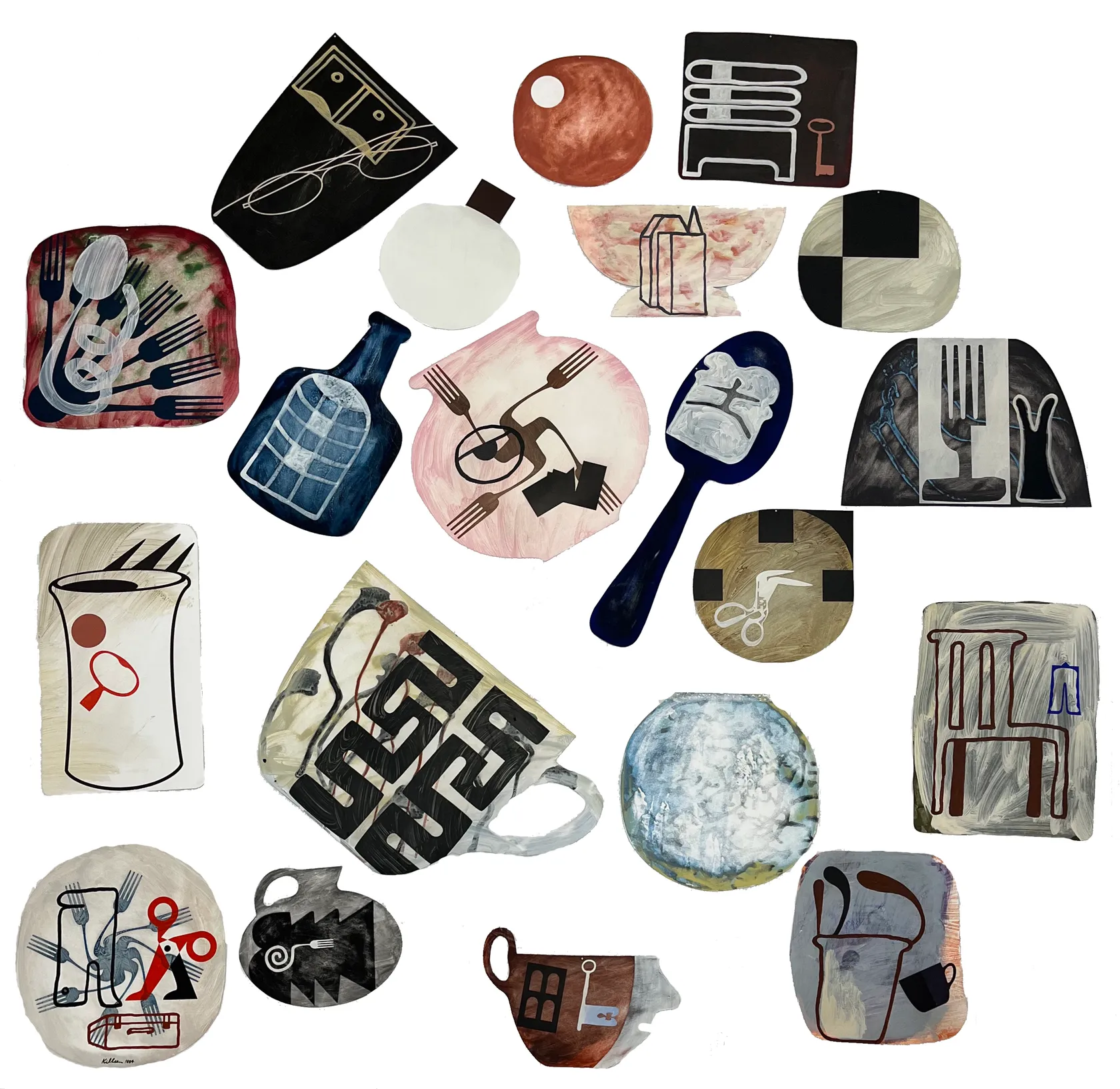 One of several works titled Still Life with James Joyce (another 79 piece iteration made in 1994 interrupted a line of Measuring Tools works and in 1995, Killeen made a 29 piece version), like the others, this one includes computer-generated images from Killeen’s codex. Each features conventional still-life objects rendered as patterns: fork designs, spiralling, or spreading like a fan, as well as teacups, bottles, spoons and distorted scissors and spoons. Joyce’s iconic wire-framed spectacles, evidence of his eyesight problems, which defined his image in photographs and caricatures, are reproduced
