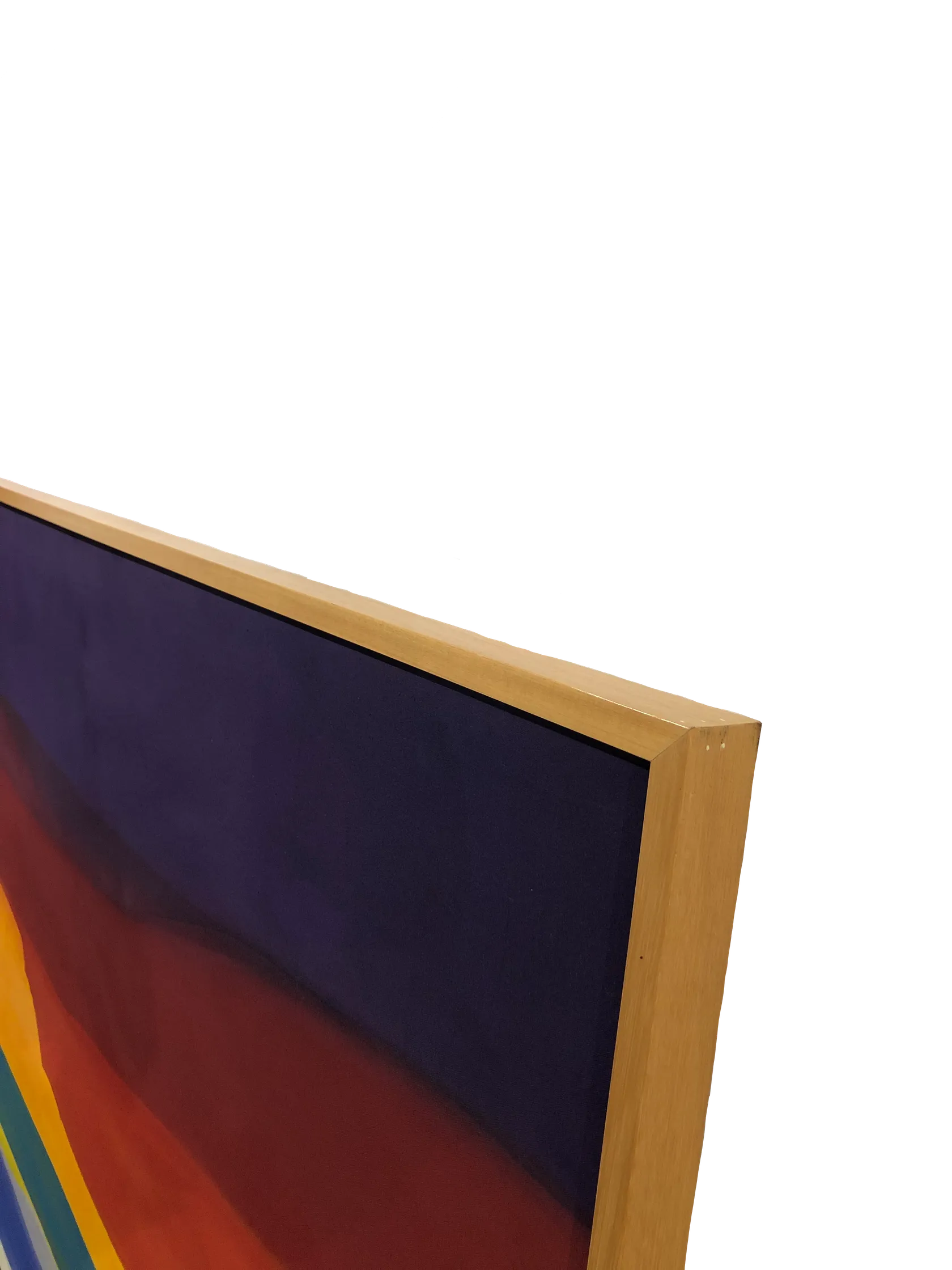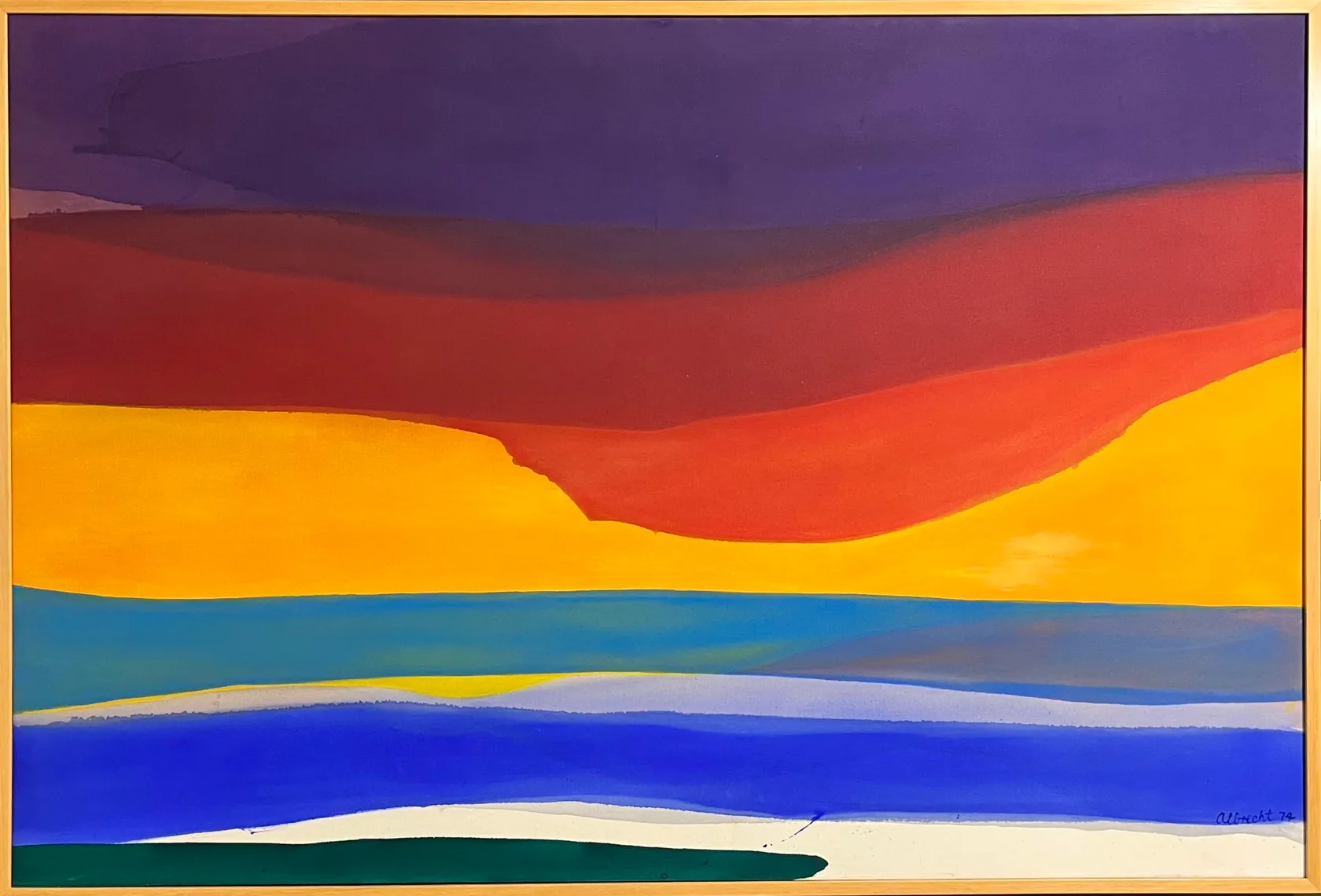 Staining her canvas with acrylic paint allowed her to achieve light veils of transparent colour which lift and float like silk scarves in the wind. Here she has rendered a sunset brewing over the sea as bands of a brilliant rainbow. A sense of immensity is achieved in the horizontal expansiveness, but also the effect of movement, perhaps of the sea surging, and the clouds gathering as the sun dips below the horizon. Hovering between abstraction and representation, Albrecht’s paintings in this period were described approvingly by critic Hamish Keith as resembling the layers in a Victorian sand bottle.