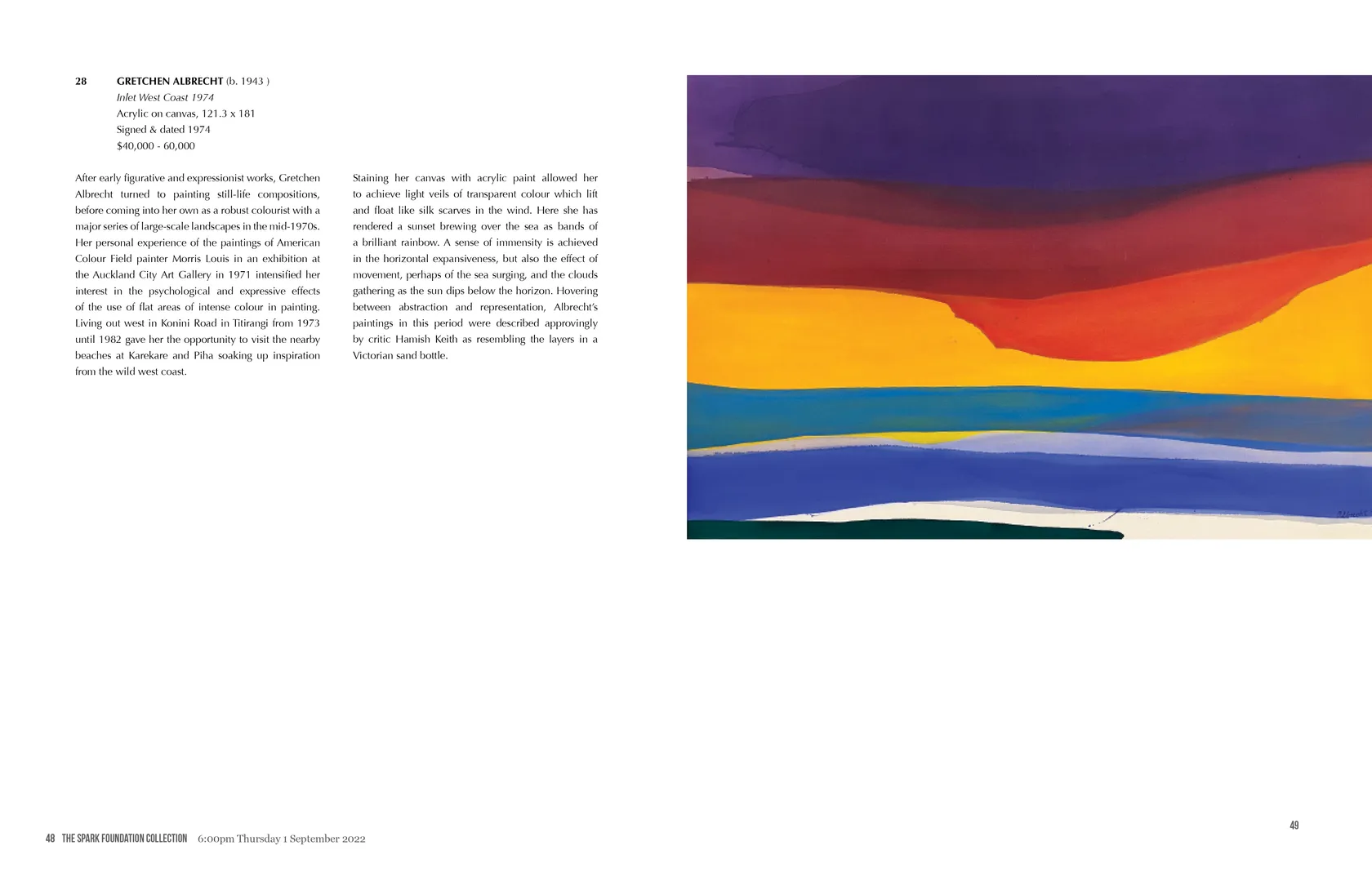 After early figurative and expressionist works, Gretchen Albrecht turned to painting still-life compositions, before coming into her own as a robust colourist with a major series of large-scale landscapes in the mid-1970s. Her personal experience of the paintings of American Colour Field painter Morris Louis in an exhibition at the Auckland City Art Gallery in 1971 intensified her interest in the psychological and expressive effects of the use of flat areas of intense colour in painting. Living out west in Konini Road in Titirangi from 1973 until 1982 gave her the opportunity to visit the nearby beaches at Karekare and Piha soaking up inspiration from the wild west coast.