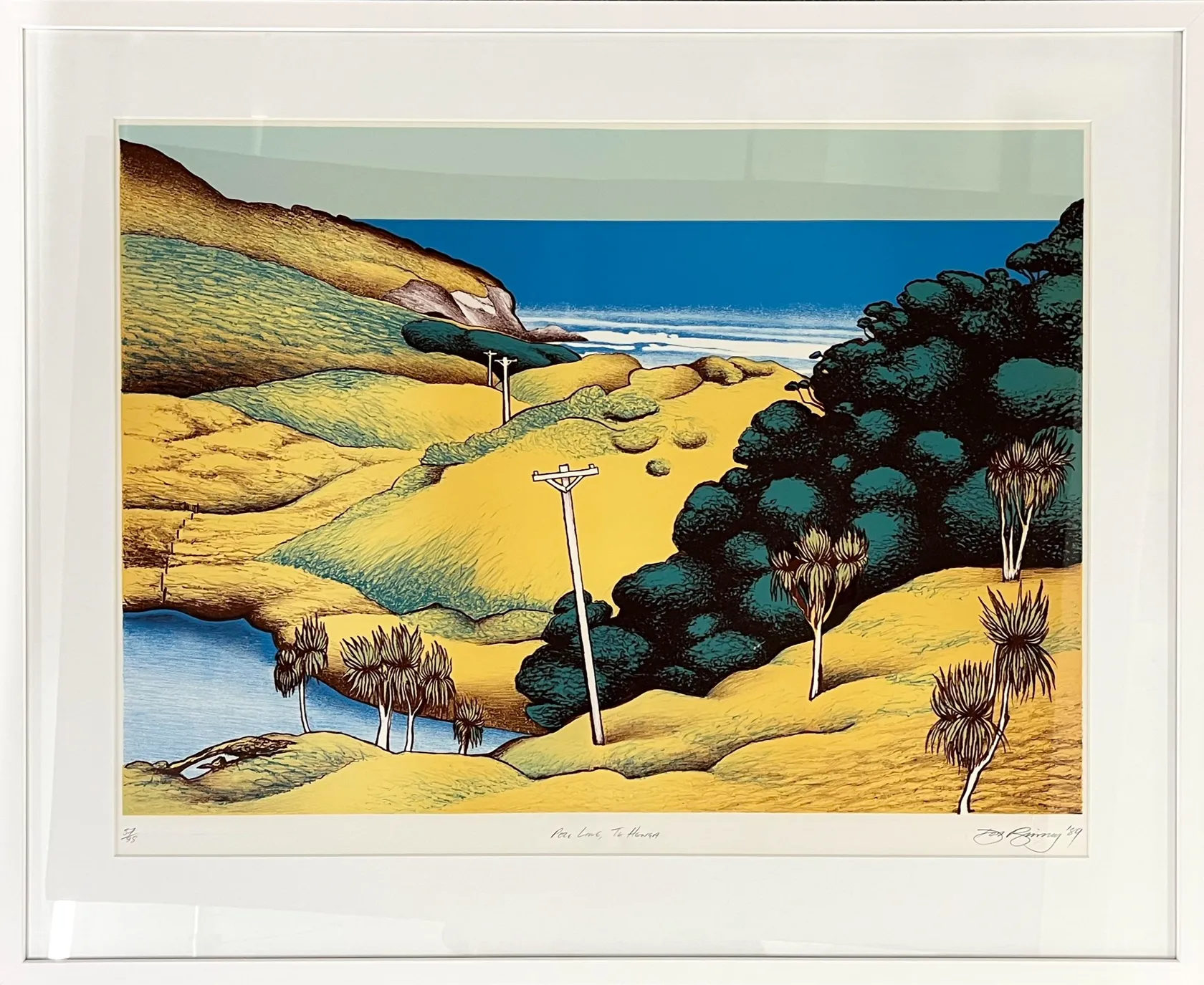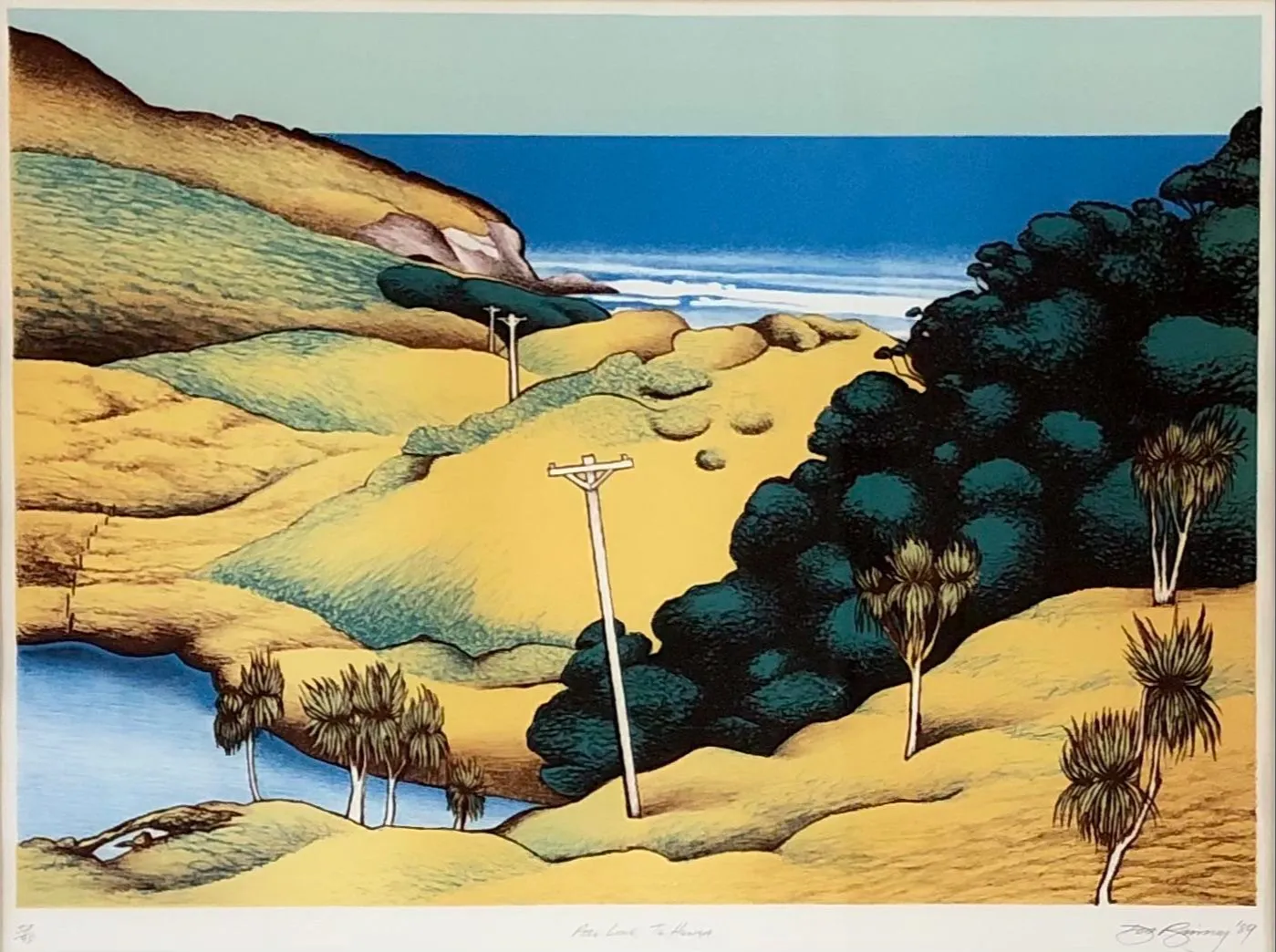 Signed, inscribed Pole Line, Te Henga & dated 1989
