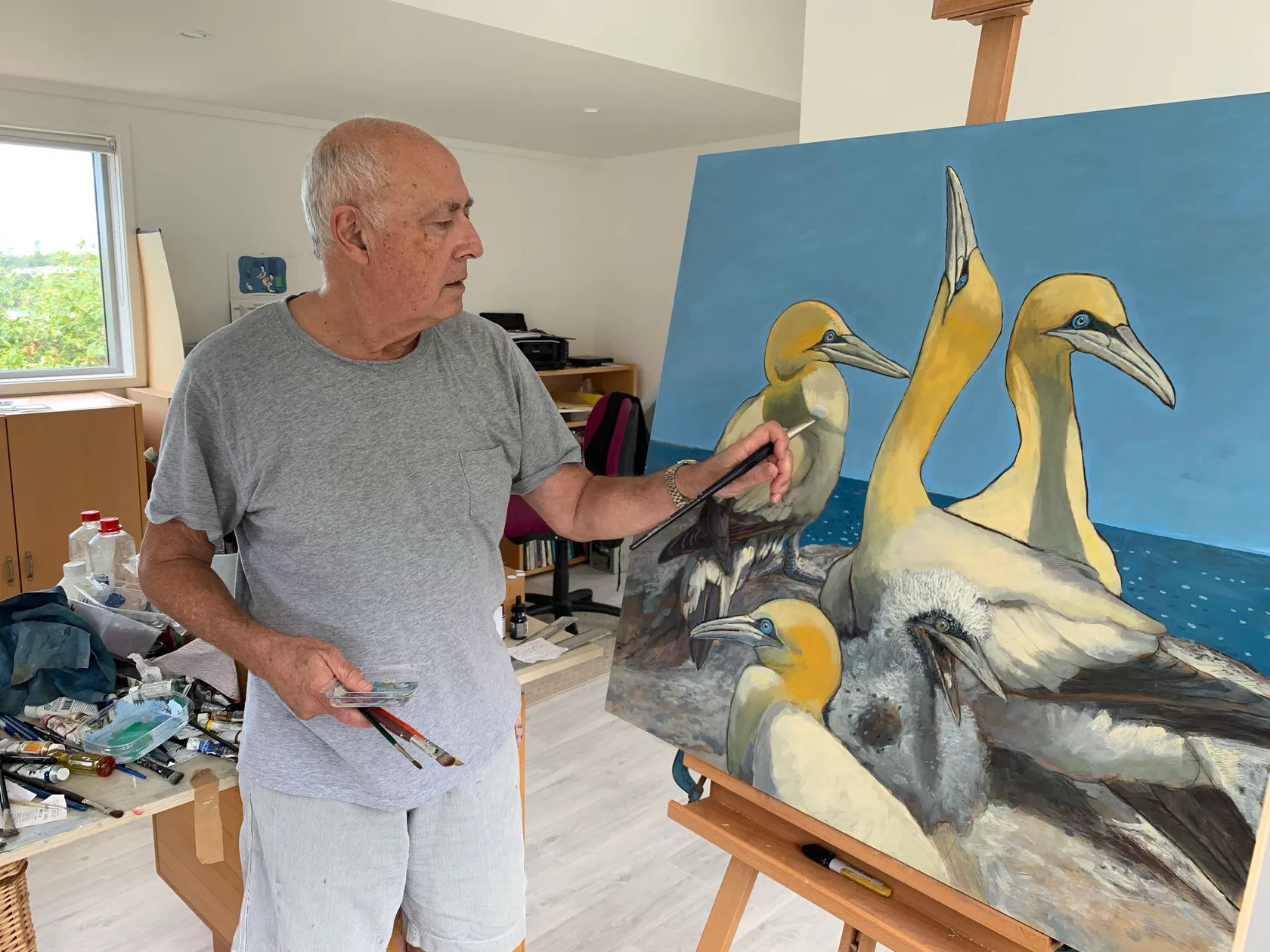 Russell Jackson draws his subject matter from his interest in ornithology and archaeology. He is especially known for his coastal landscapes and birdlife rendered with a particularly New Zealand feel, in enamel paint. Former dealer Peter Webb has described him as “the most important naturalist painter in New Zealand.” Jackson says, “My landscapes are affirmative and pleasurable, rather than revolutionary. I speak directly to my audience, confirming the fact of place and living things in the World. The art critic for Art New Zealand, John Daly-Peoples, calls me a “green artist” for my series “The Ascension of Trees. I move between the figurative and the abstract and from the pictorial to picture plane. To me, they are just different modes of expression. Half my painting life has been refining and tightening. Now my work is increasingly loose, open to chance and painterly gesture, like my series “The King is Dead,” featuring animal-head Egyptian gods. Over recent years the subject of my paintings have included cows which occupied Auckland’s volcanic cone reserves. My studio is now set in a garden in Parnell and I find the flowers are a colour inspiration and I’ve been experimenting with a botanical theme.” Jackson was born in 1947 in Auckland. He comes from a family of artists including his father, Case Jackson, and brother, Paul Jackson. As a youngster, Russell was exposed early to the visual arts community – from Keith Patterson to Colin McCahon. This lead him to see the possibility of art as a future profession. Jackson studied Art History at Auckland University and Graphic Arts at the Auckland University of Technology, from 1968 – 71. He learnt lithography at the Elam Art School and did etching classes under Carole Shepheard and Rodney Fumpston. Following a short time as a graphic artist, he has been a full time painter since 1974.