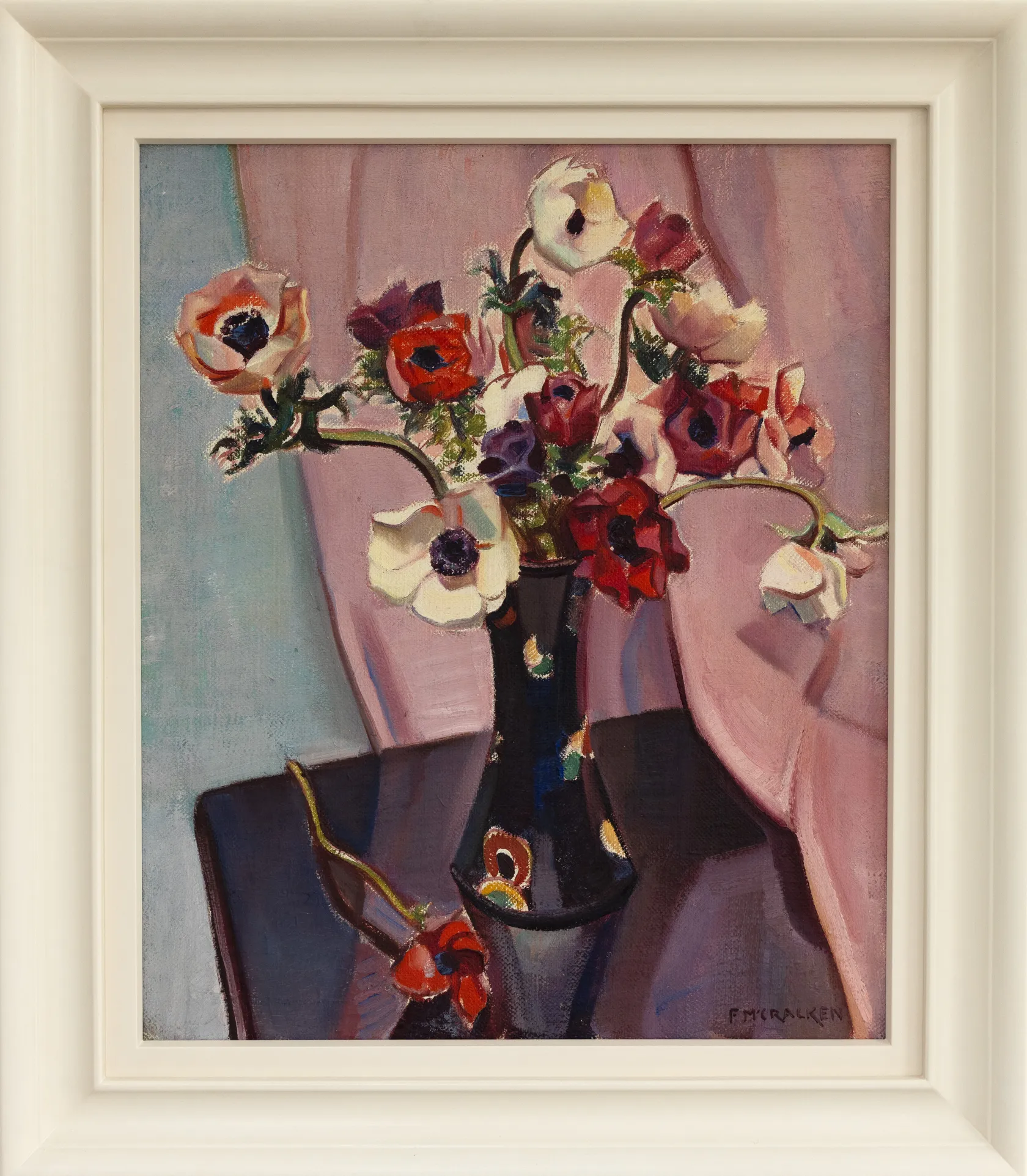 Born in Northern Ireland, McCracken trained at Auckland’s Elam School of Art before serving with the New Zealand Expeditionary Force in World War I, where he was wounded at Ypres. He continued his studies at the Royal Scottish Academy and later in Paris under the Cubist master André Lhôte. The influence of both Cubism and the Scottish Colourists, particularly S.J. Peploe, is evident in his structured compositions and luminous palette.
