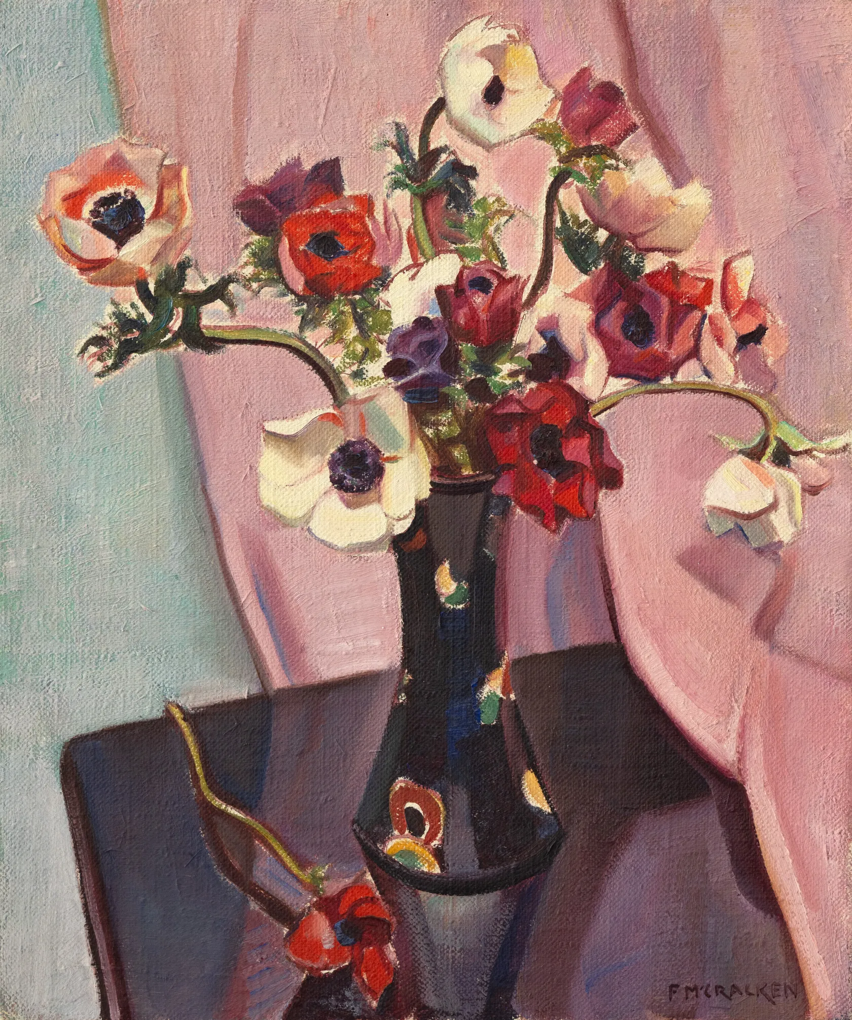 It is rare to uncover a hidden painting, let alone to find two hidden works. Beneath the surface of Anemones (Lot 11) lay two complete earlier works, each more traditional in treatment than the last. Together they chart Francis McCracken’s evolution as an artist, from academic naturalism to a confident modernist voice shaped by European colour and form.