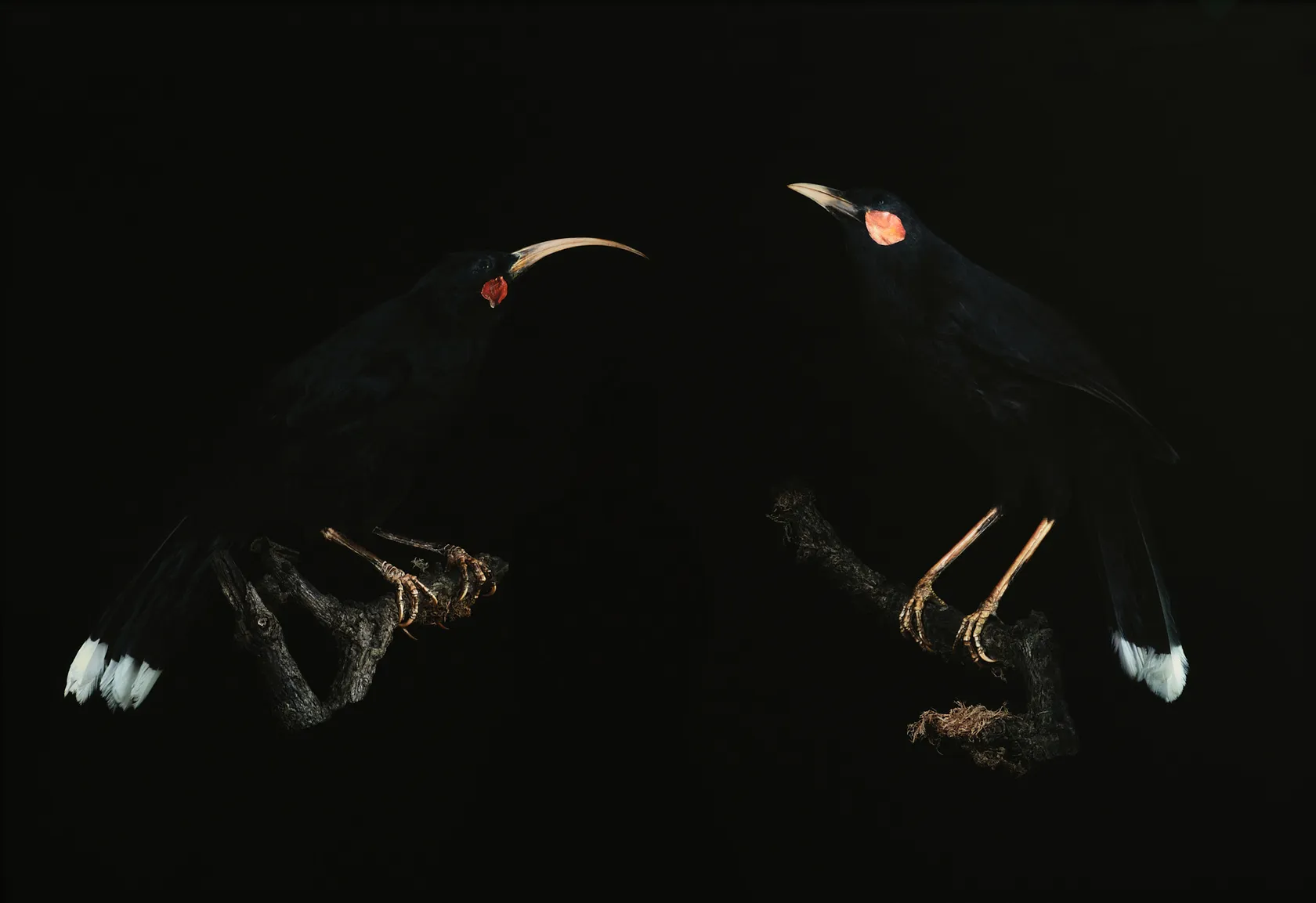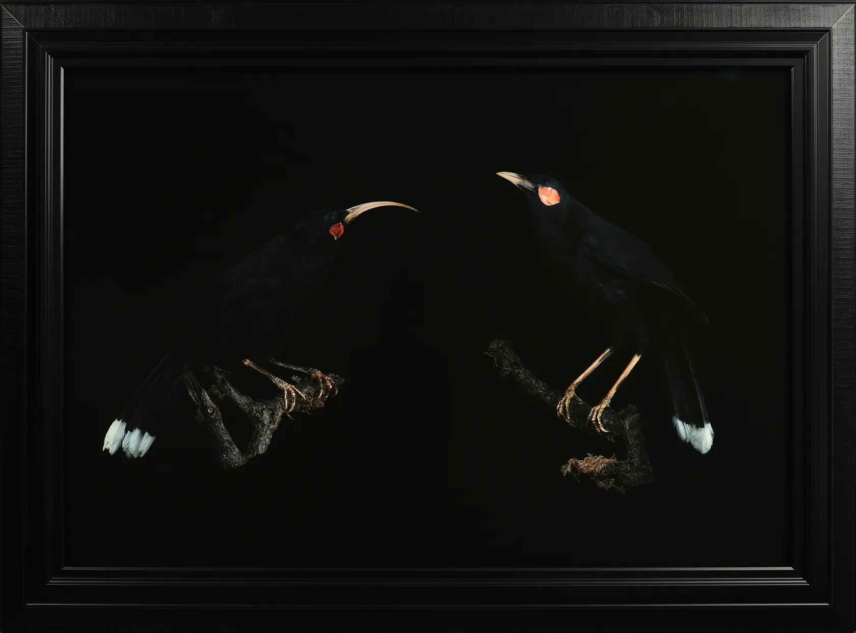 Pardington has built a significant practice around reanimating taonga from museum collections, restoring dignity to objects and specimens often removed from their original context. This work reflects that approach. Her handling of light and depth draws out each feather and contour with precision, suggesting presence rather than preservation. The black ground acts not as a void but as a frame, allowing the pair to register as companions rather than scientific subjects.