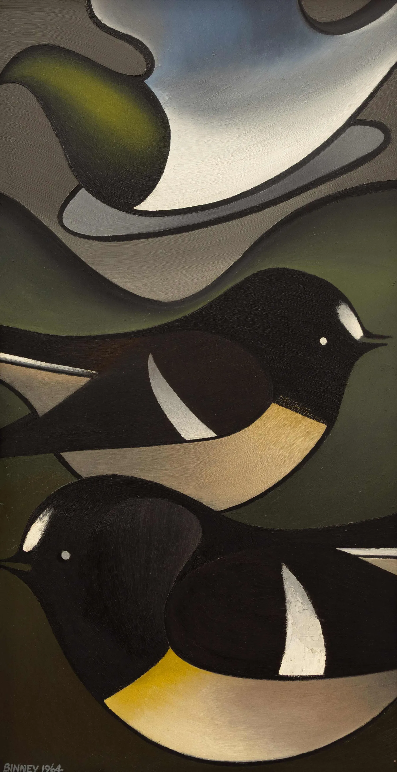 Inscribed RUSSELL FINNEMORE. Colin McCahon May-August ‘65 (brushpoint, b.r.); Five: / Russell Finnemore & / Colin McCahon / P.V.A. / 25gns N.F.S. (on reverse)