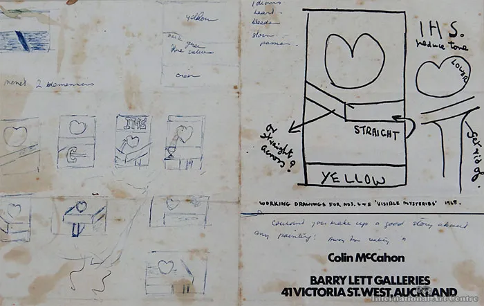 Barry Lett Galleries invitation to Colin McCahon exhibition with pen drawings of exhibition by an unknown hand, 1968