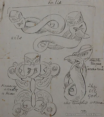 Sketches of Huia Box Carvings & a further sketch verso