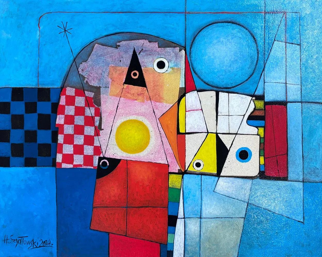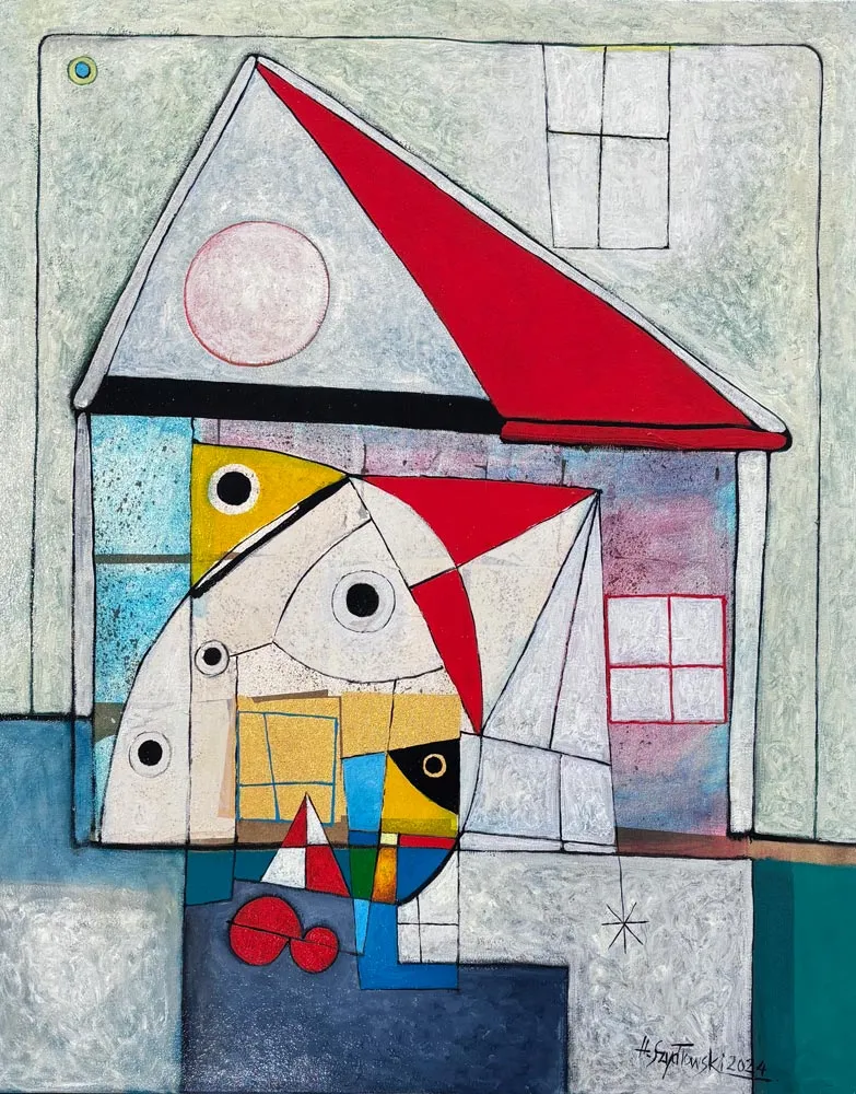 Here we are welcomed into Szydlowski's world through the open door of a red and blue roofed house. Ushered into a room with windows and chequered floor tiles of red and gold we join the enchantment.