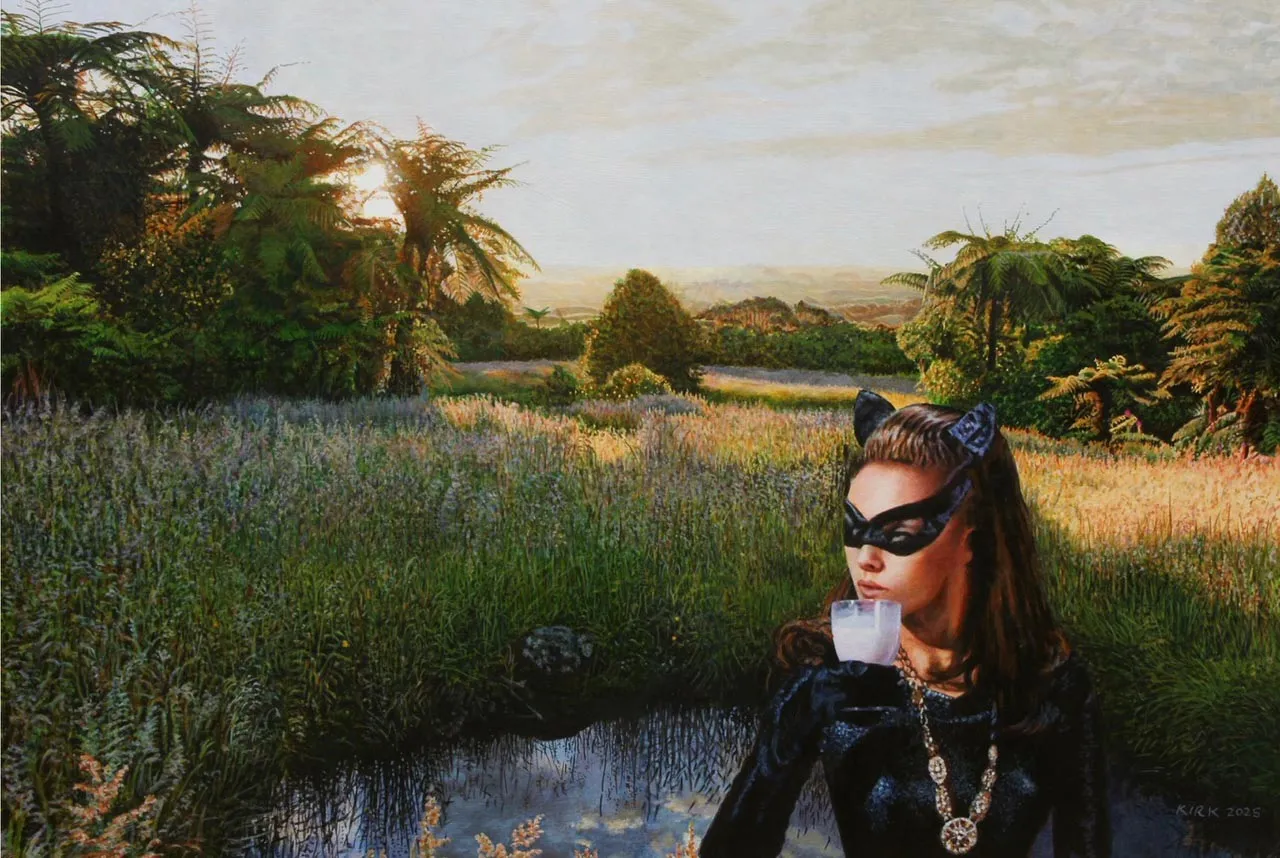 Kirk’s imaginative blending of pop-culture icons and Superheroes set in New Zealand landscapes create a playful dialogue between fantasy and everyday life
