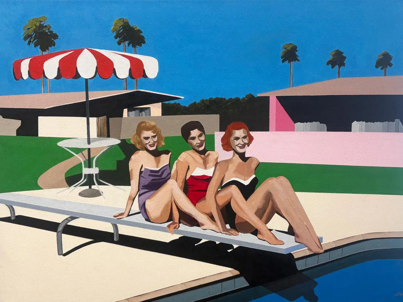 Two New Zealand women artists channel their talents in this creative and colourful tour d’force. Inspired by her recent visit to Paris to view David Hockney’s major retrospective at the Louis Vuitton Foundation, Jane Martin further explores the theme of 1950’s Poolside Americana. With a whisper of nostalgia the viewer partakes of Californian fun beneath palm trees and blue skies.