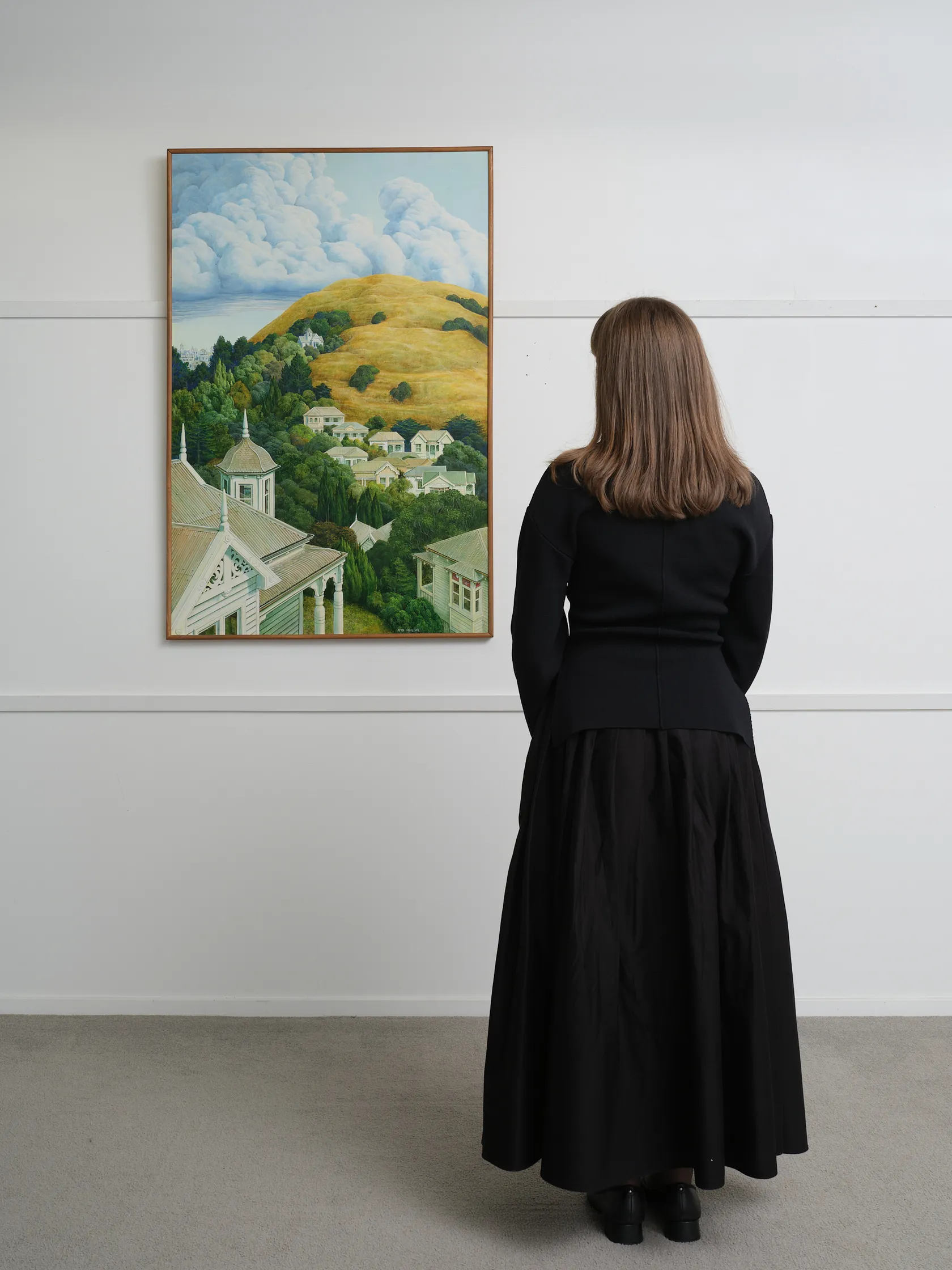 Peter Siddell’s City with Towered Houses is a masterful example of the artist’s ability to transform the familiar into the uncanny. Painted in his signature hyperreal style, the work presents a meticulously rendered Auckland suburb, its rows of early 20th-century villas nestled into the lush contours of a hillside beneath a vast, brooding sky.