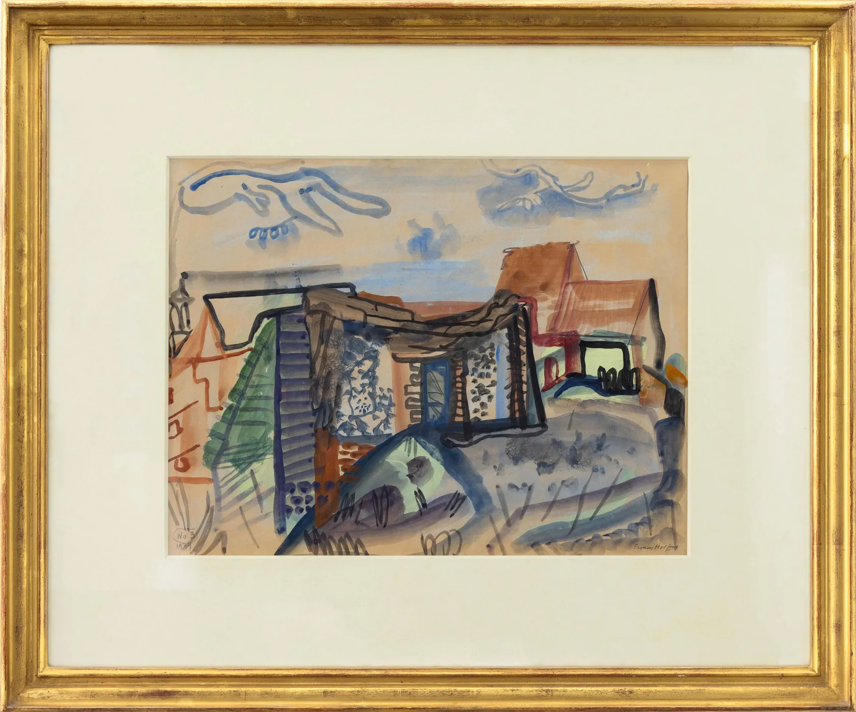 And with her peripatetic nature Hodgkins took every opportunity to venture out into the countryside in a constant quest for new subject matter. It was only with the arrival of WWII that she was forced to make a more permanent base in Corfe Castle, Dorset. East Anglian Farm is painted rapidly but with a remarkably steady brush. The radiant skies of high summer are suggested by a pellucid blue wash outlining anamorphic clouds that bear little resemblance to natural phenomena. Although often attracted to the discarded piles of detritus that were a feature of certain farmyards, here the buildings themselves are broken up into their respective parts, as clusters of steeply pitched roofs, and distinct means of wall construction. Horizontal boards are outlined in blue, serving as a bulwark to a pebbled wall suggestive of knapped flint, which are a common feature of traditional buildings in a number of England’s southern counties. These are balanced in turn by a section of red brick. Behind the central structure another building on the left consists simply of bold outlines in red ochre and black, bracketed on the far right by another farm structure that is more readily identified as a building. You can sense Hodgkins’ enjoyment in her mark making, each brushstroke translating what she observes into something akin to an abstracted patchwork. It is as if the compilation of walls and roofs have become untethered from their foundations and freed to move like dancers on a stage, in an interpretation full of verve and humour.